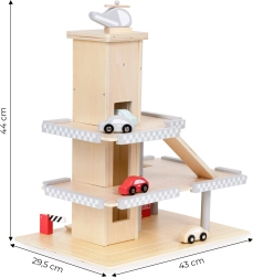 Περιλαμβάνεται ελικόπτερο με ελικοδρόμιο στη στέγη, 4 αυτοκινητάκια, πρατήριο καυσίμων και κινητή μπάρα για ρεαλιστικό παιχνίδι. Η ποιοτική ξύλινη κατασκευή χωρίς αιχμηρές άκρες διασφαλίζει 100% ασφάλεια στο παιχνίδι.