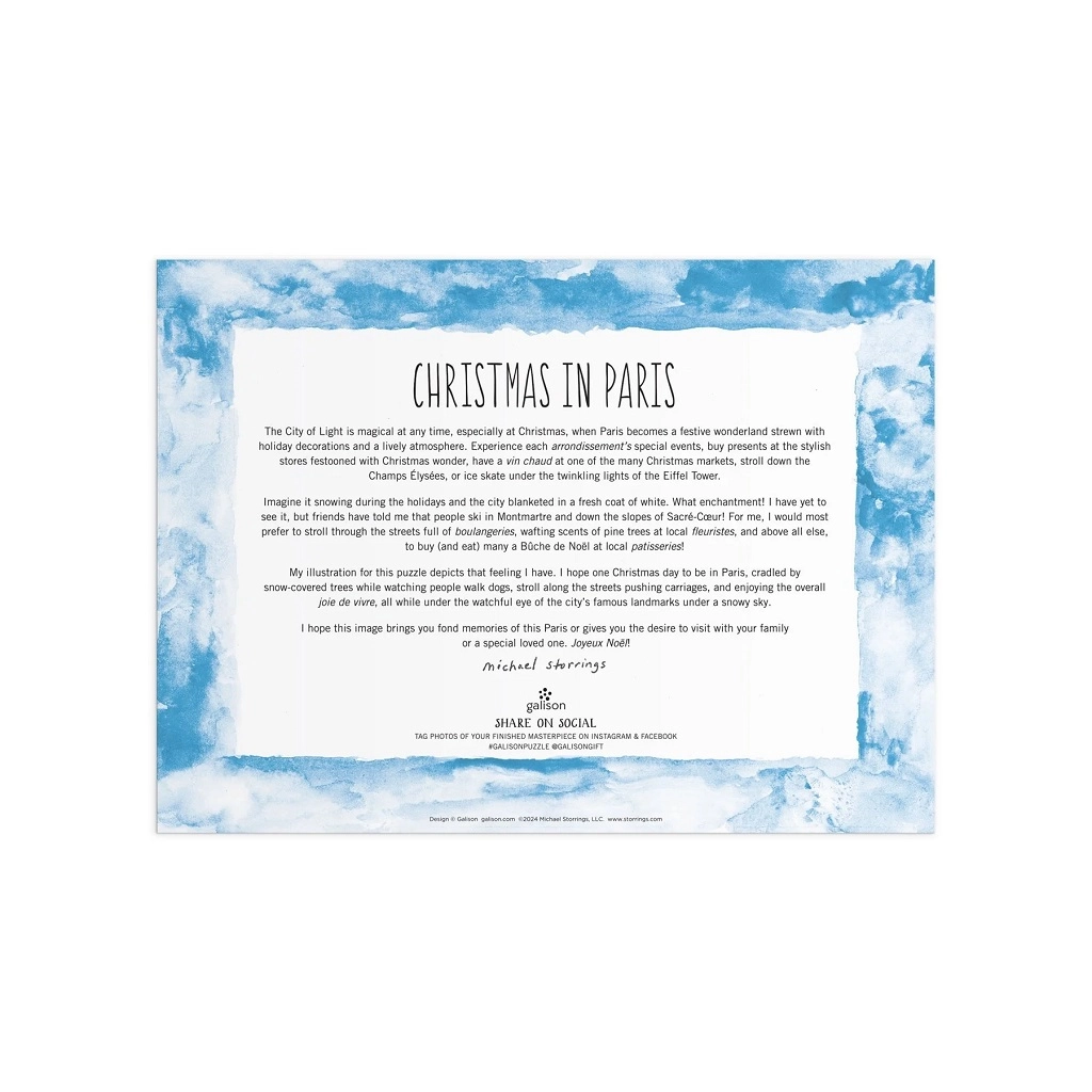 Ανακαλύψτε τη μαγεία του χειμερινού Παρισιού στη λεπτομερή εικονογράφηση του Michael Storrings. Μια πλούσια σκηνή γεμάτη φωτάκια, μαγαζιά και χριστουγεννιάτικη ατμόσφαιρα που θα ενθουσιάσει λάτρεις της τέχνης και απαιτητικούς παζλέρ. Η ειδική φιλμ επιφάνεια λάμπει μεταλλικά στο φως, χαρίζοντας στην ολοκληρωμένη εικόνα μια μοναδική premium όψη.