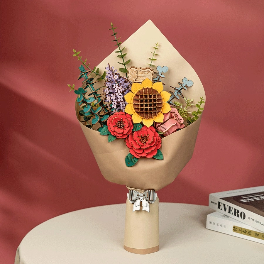 Ανακαλύψτε τη μαγεία μιας ανθοδέσμης που δεν χάνει ποτέ την ομορφιά της. Το ξύλινο 3D παζλ περιλαμβάνει ηλίανθο, πασχαλιά, κόκκινη καμέλια, ροζ τριαντάφυλλο και ευκάλυπτο. Κάθε λουλούδι διαθέτει ρυθμιζόμενο ύψος μίσχου, επιτρέποντας ποικίλες συνθέσεις.