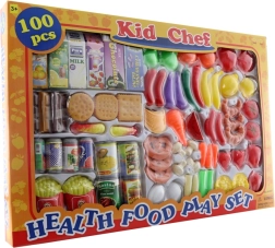 Ανακαλύψτε ένα διασκεδαστικό και πολύχρωμο παιχνίδι κουζίνας με αυτό το μεγάλο σετ φαγητού για παιδιά. Η συσκευασία περιλαμβάνει 100 τεμάχια, όπως φρούτα, λαχανικά, αρτοσκευάσματα, γλυκίσματα καθώς και κονσέρβες και χάρτινα ροφήματα. Ιδανικό για ανάπτυξη φαντασίας, εκμάθηση χρωμάτων και σχημάτων και κοινό παιχνίδι. Κατάλληλο από 3 ετών.