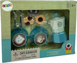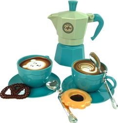 Αυτό το παιδικό σετ καφέ σε όμορφο τιρκουάζ χρώμα είναι ιδανικό για παιχνίδι καφετέριας ή για «σπιτική» υποδοχή καλεσμένων. Το σετ περιλαμβάνει χρωματιστά μοτίβα για τον καφέ, επιτρέποντας στους μικρούς barista να ετοιμάζουν καφέ με διάφορα σχέδια. Η καφετιέρα του σετ βοηθά να φαίνεται επαγγελματικό.