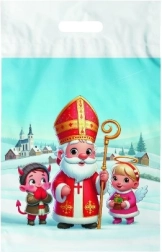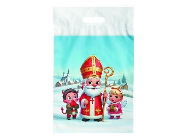 Διακοσμητική νάιλον σακούλα με στάμπα του Αγίου Νικολάου, αγγέλου και διαβόλου, ιδανική για το πακετάρισμα των δώρων του Αγίου Νικολάου. Το μέγεθος 29×46 cm προσφέρει αρκετό χώρο για γλυκίσματα, παιχνίδια και μεγαλύτερα δώρα, με εντυπωσιακό και χαρούμενο μοτίβο.