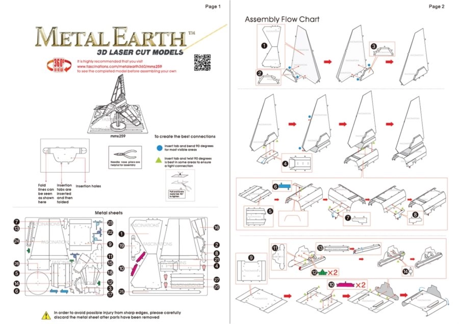 Το κιτ περιλαμβάνει 2 χαλύβδινα φύλλα με κομμάτια και εικονογραφημένο οδηγό. Η συναρμολόγηση γίνεται χωρίς κόλλα – τα κομμάτια ενώνονται με κουμπώματα και λυγισμένες γλωττίδες. Συνιστάται χρήση μικρής πένσας και κοφτών (δεν περιλαμβάνονται).