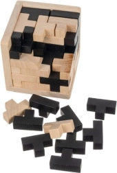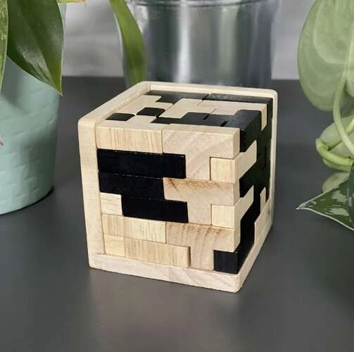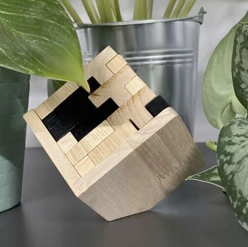Αυτό το κομψό ξύλινο παζλ σε φυσικό και μαύρο φινίρισμα είναι ιδανικό για προπόνηση μυαλού αλλά και ως διακοσμητικό design στο τραπέζι. Το σετ περιλαμβάνει προσεκτικά επεξεργασμένα, μη τοξικά κομμάτια σε σχήμα «T», τα οποία, όταν συναρμολογηθούν σωστά, δημιουργούν έναν συμπαγή, χρωματικά συνδυασμένο κύβο. Χάρη στην ακριβή κατασκευή, η συναρμολόγηση είναι ομαλή, ευχάριστη και εθιστική.