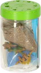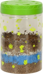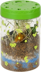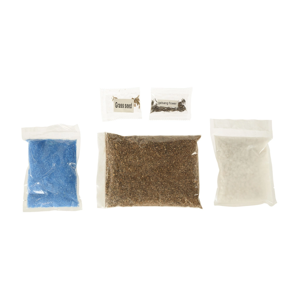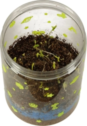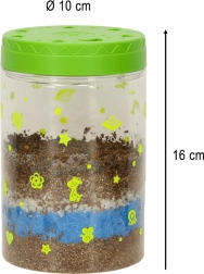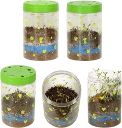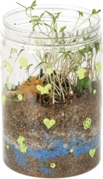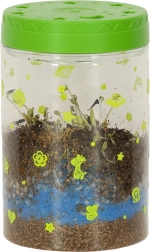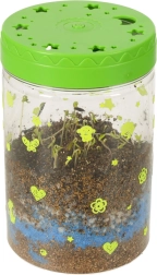 Το διαφανές πλαστικό δοχείο με οπές αερισμού είναι ιδανικό για την φύτευση των παρεχόμενων σπόρων. Στη συσκευασία περιλαμβάνεται χώμα και χρωματιστές πέτρες, τις οποίες τα παιδιά τοποθετούν σύμφωνα με τις οδηγίες. Οι λυχνίες LED στο καπάκι του τεραρίου υποστηρίζουν την ανάπτυξη των φυτών, ενώ παρέχουν ήπιο νυχτερινό φωτισμό.