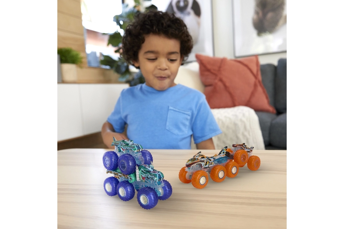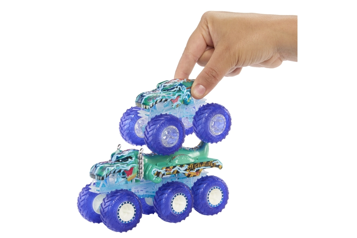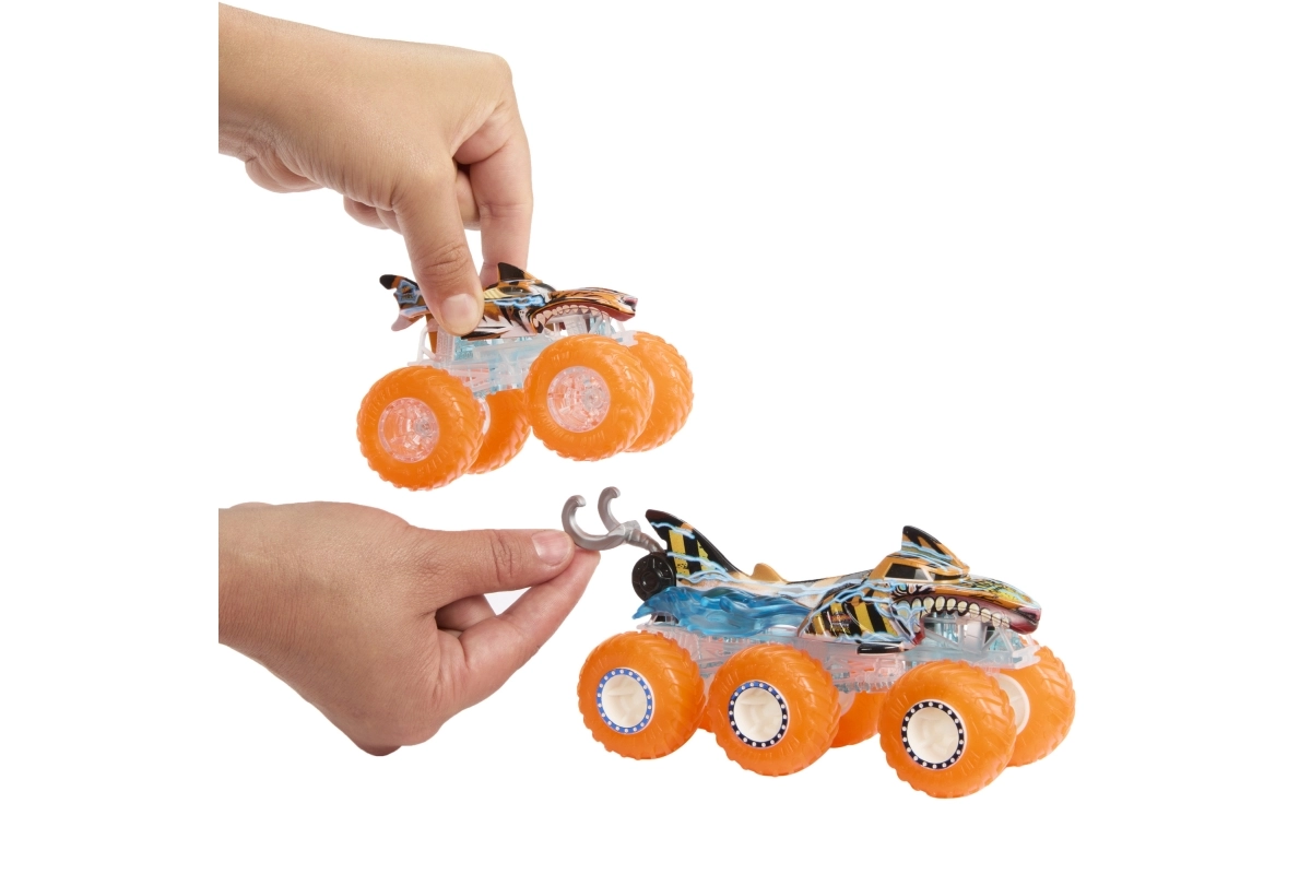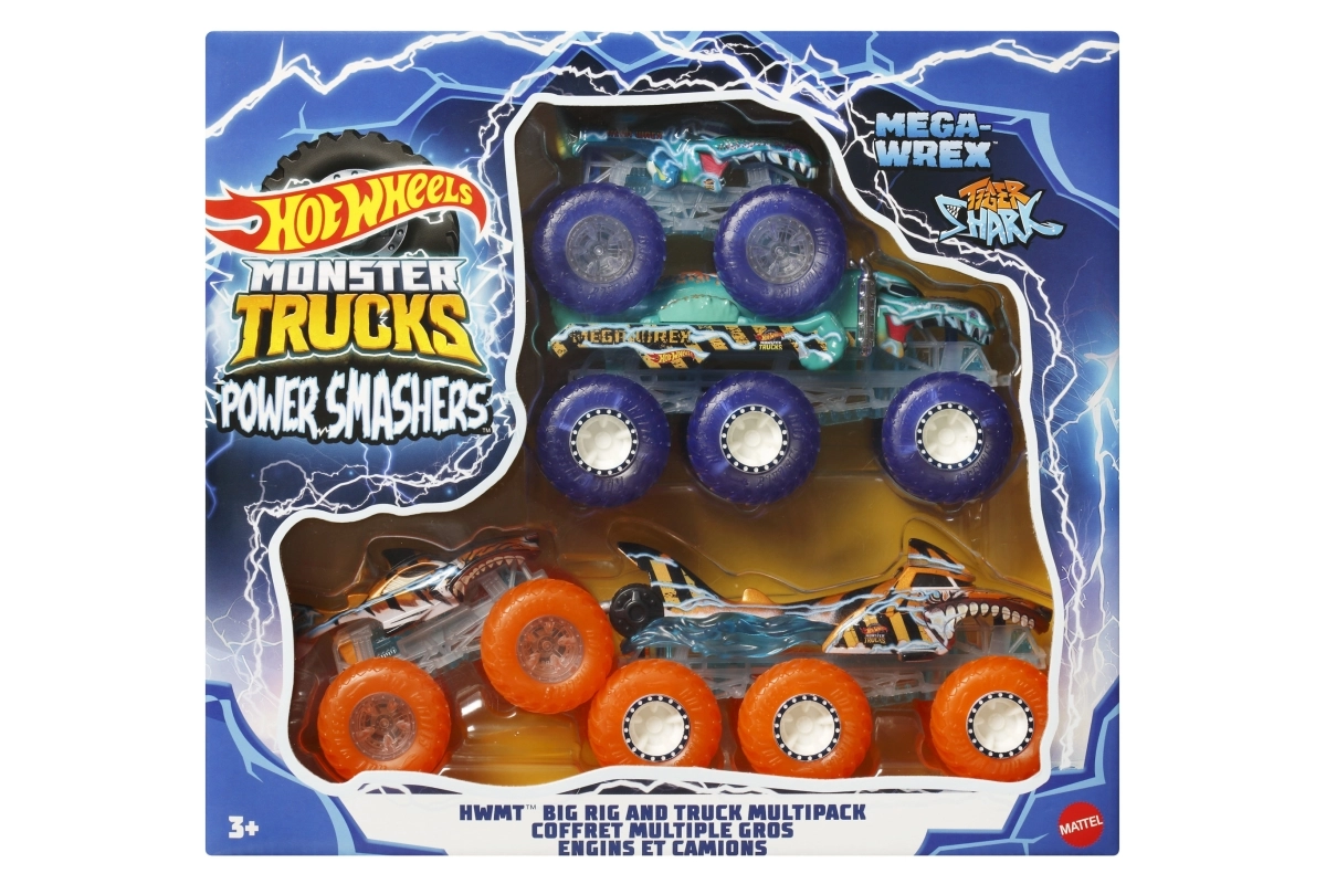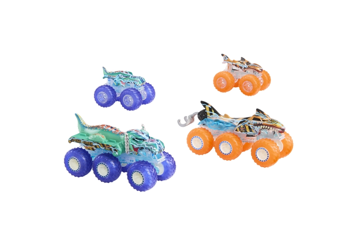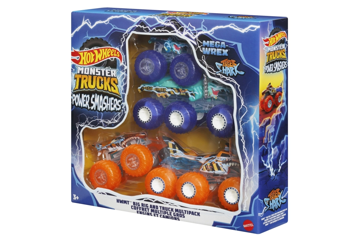 Το σετ περιλαμβάνει τα δημοφιλή μοντέλα Tiger Shark και Mega-Wrex με αντίστοιχες διακοσμήσεις, ιδανικά για τους φίλους των Monster Trucks.