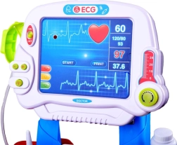 Η παιδική οθόνη εμφανίζει το διάγραμμα EKG και συνοδεύει το παιχνίδι με φώτα και ήχους, προσδίδοντας ρεαλισμό στην εξέταση και κρατώντας τα παιδιά σε δράση.