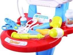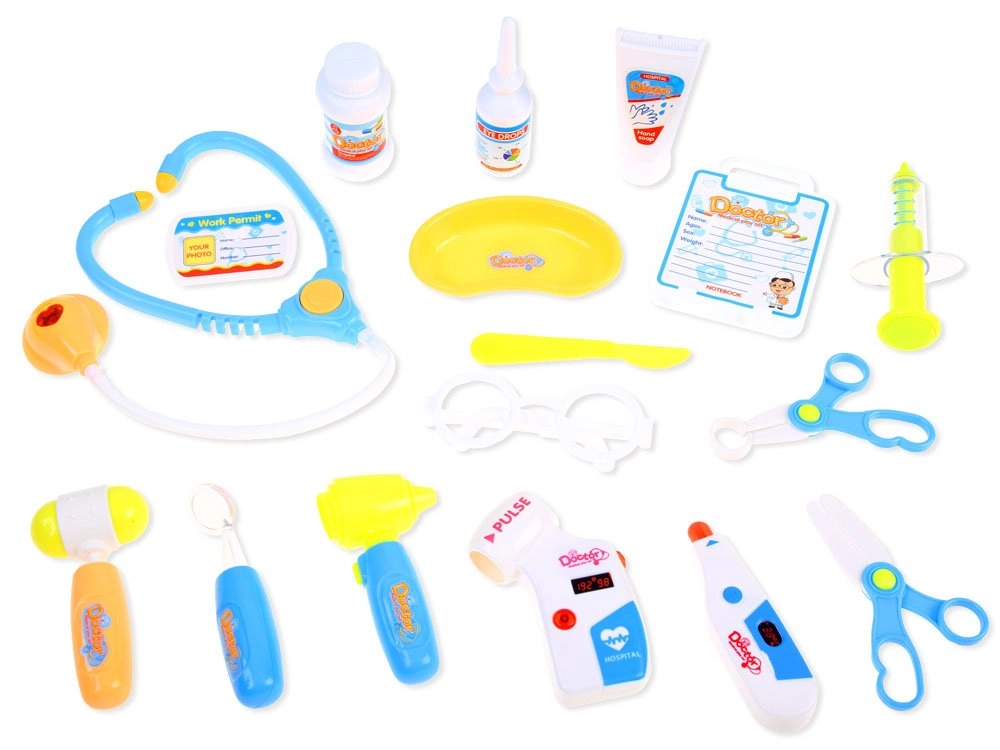 - Καρότσι με οθόνη, γυαλιά, στηθοσκόπιο, θερμόμετρο με ρύθμιση και οπίσθιο φωτισμό, ωτοσκόπιο με φως, πιεσόμετρο με ρύθμιση και οπίσθιο φωτισμό, νευρολογικό σφυράκι, σύριγγα, οδοντιατρικός καθρέφτης με φως, 2× ψαλίδι, νυστέρι, μπολ, απομίμηση απολυμαντικής κρέμας, οφθαλμικές σταγόνες, δοχείο φαρμάκων, καρτελάκι γιατρού, κάρτα ασθενούς