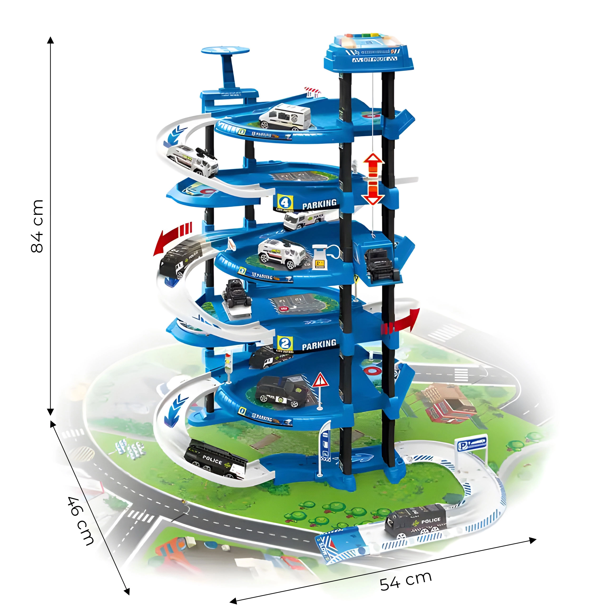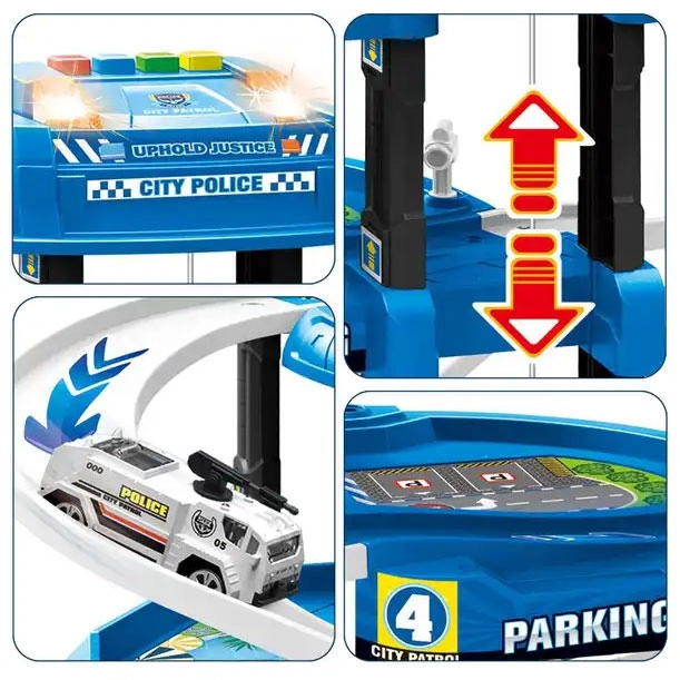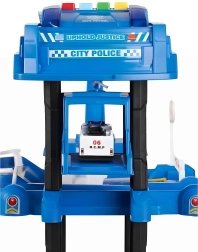 Μεγάλο αστυνομικό παρκινγκ με πέντε επίπεδα και ελικοδρόμιο που προσφέρει ώρες δημιουργικού παιχνιδιού. Περιλαμβάνει 2 αυτοκίνητα και ελικόπτερο, κινούμενο ασανσέρ, φωτεινά και ηχητικά εφέ, μπάρες, σήματα και αστική επιφάνεια παιχνιδιού. Ασφαλής κατασκευή χωρίς αιχμηρές άκρες, κατάλληλο από 3 ετών, ιδανικό για την ανάπτυξη της φαντασίας και της λεπτής κινητικότητας.