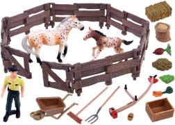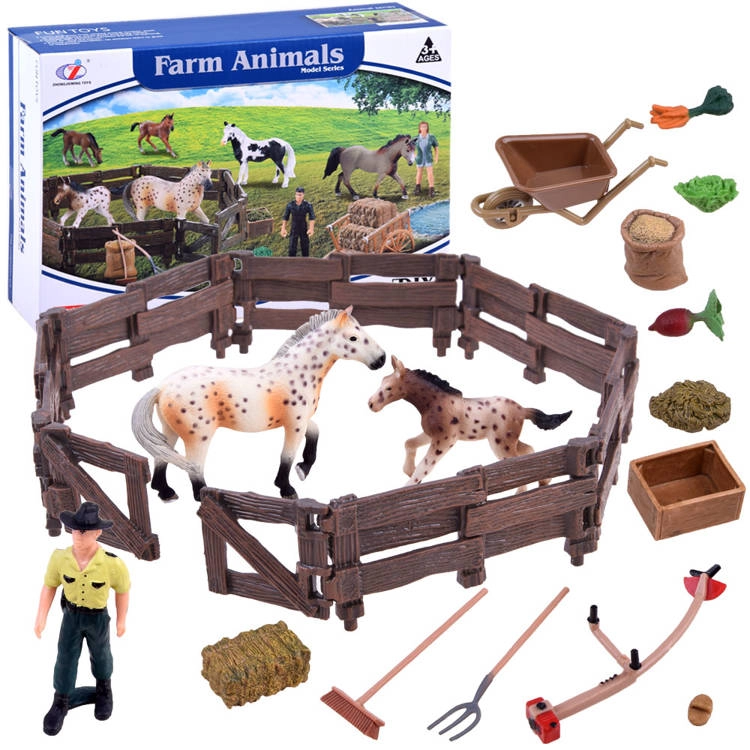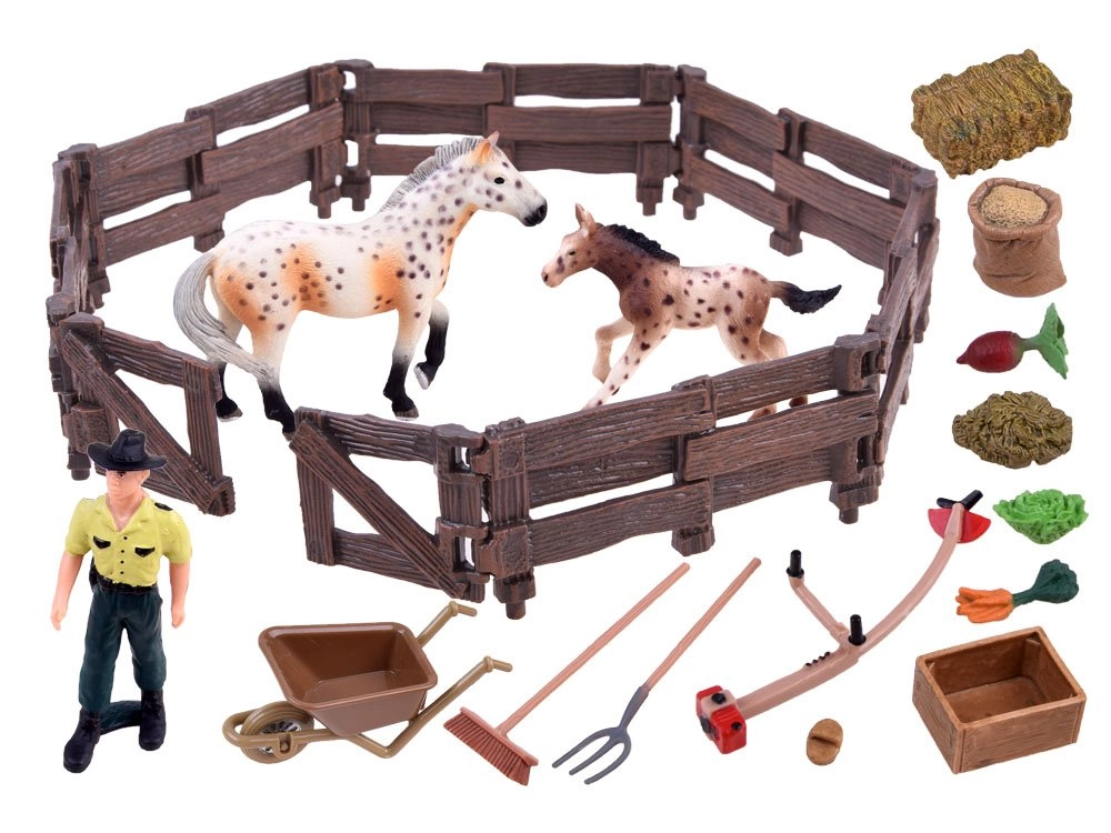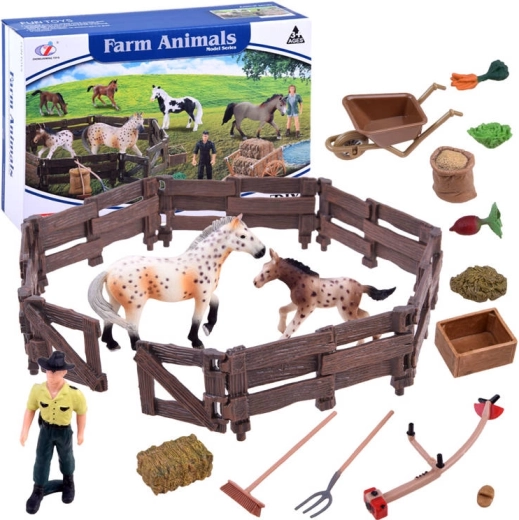 Αυτό το πλούσια εξοπλισμένο σετ μεταφέρει τα παιδιά στον κόσμο της φάρμας. Περιλαμβάνει δύο ρεαλιστικά επεξεργασμένες φιγούρες αλόγων (φοράδα και πουλάρι), αγρότη, περίφραξη και πολλά αξεσουάρ όπως καρότσι, πιρούνα, τσουγκράνα, παχνί και τροφή. Οι ρεαλιστικές λεπτομέρειες, από την υφή «ξύλου» στον φράχτη έως τον χρωματισμό των αλόγων, ενθαρρύνουν τη φαντασία και ατελείωτες ώρες παιχνιδιού.