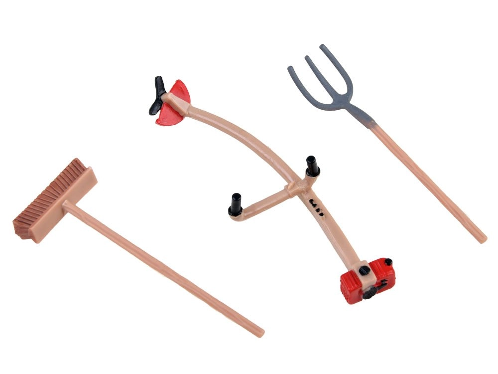 Φιγούρα αγρότη, καρότσι, τσουγκράνα, πιρούνα και άλλα αξεσουάρ για ρεαλιστικές δουλειές στη φάρμα.