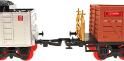 Η μαύρη ατμομηχανή με κόκκινους τροχούς φωτίζει, παράγει ήχους και, μετά την προσθήκη νερού, βγάζει πραγματικά καπνό από την καμινάδα – εμπειρία σαν σε παλιό σιδηρόδρομο.