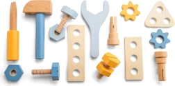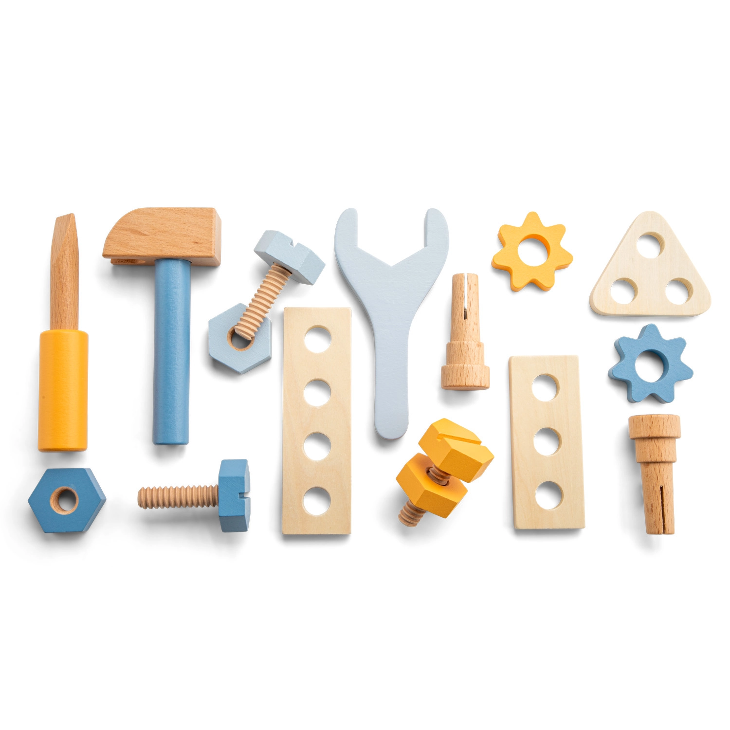 Περιλαμβάνονται 16 λειτουργικά κομμάτια: σφυρί, κατσαβίδι, κλειδί, καρφιά, βίδες και οδοντωτοί τροχοί για ατελείωτους συνδυασμούς παιχνιδιού. Το προϊόν είναι από πιστοποιημένο ξύλο FSC, αποτελώντας μια βιώσιμη επιλογή για γονείς και πλανήτη.