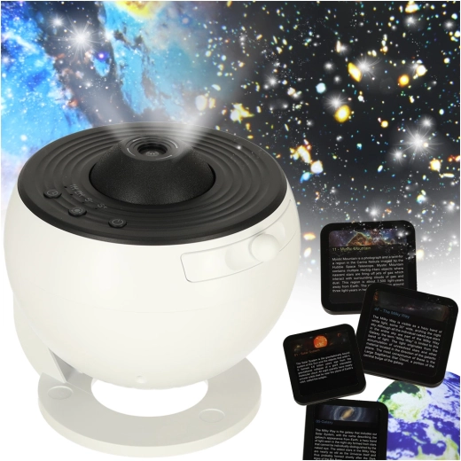 Μεταφέρετε τη μαγεία του σύμπαντος στον χώρο σας και προβάλετε αστέρια και νεφελώματα στην οροφή ή στον τοίχο. Ο προτζέκτορας χρησιμοποιεί αποδοτικά LED και, χάρη στους 12 δίσκους εικόνων, προσφέρει ποικιλία θεαμάτων – από λεπτομέρειες της Σελήνης και του Ηλιακού συστήματος έως τη Γαλαξιακή Οδό (Milky Way). Κάθε δίσκος διαθέτει περιγραφή και σύντομο εκπαιδευτικό κείμενο (EN), ώστε να διασκεδάζετε και να μαθαίνετε.