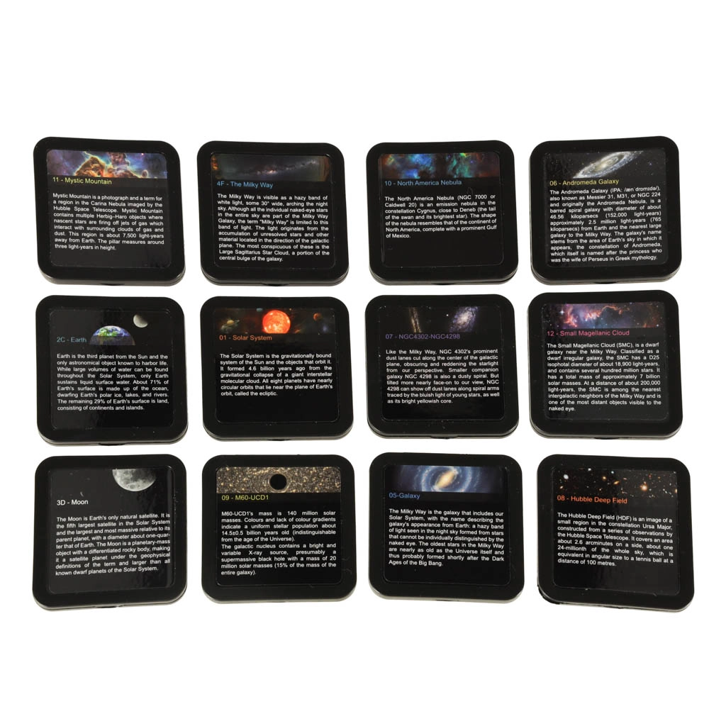 Πλούσια συλλογή θεμάτων: Γη, Σελήνη, Ηλιακό σύστημα, γαλαξίες και άλλα. Κάθε δίσκος με περιγραφή και σύντομη επεξήγηση για διασκεδαστική μάθηση.