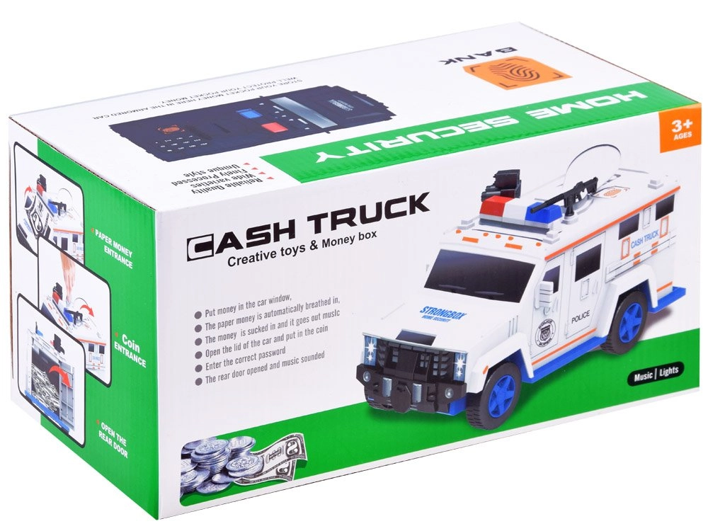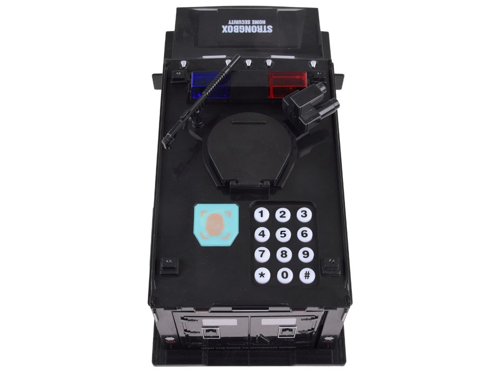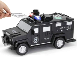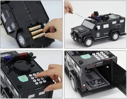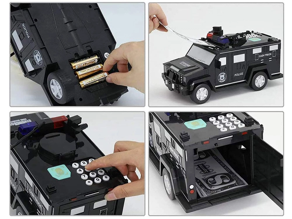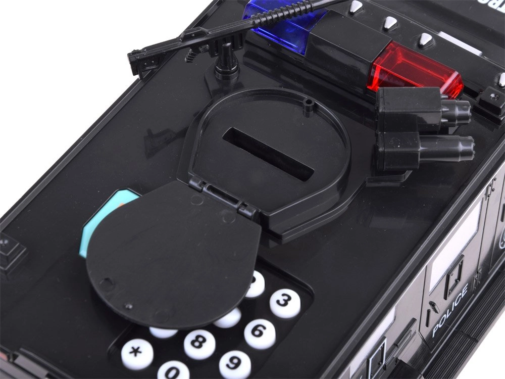 Αυτός ο διαδραστικός κουμπαράς σε σχήμα περιπολικού προστατεύει τις παιδικές αποταμιεύσεις και ταυτόχρονα διασκεδάζει. Τα παιδιά μπορούν να εισαγάγουν τον κωδικό ασφαλείας (προεπιλογή 0000), να τον επιβεβαιώσουν αγγίζοντας τον σαρωτή δακτυλικού αποτυπώματος (προσομοίωση) και να ανοίξουν την πόρτα του χρηματοκιβωτίου. Τα χαρτονομίσματα εισάγονται αυτόματα από την μπροστινή σχισμή, ενώ τα κέρματα εισάγονται από το επάνω άνοιγμα κάτω από το κάλυμμα.