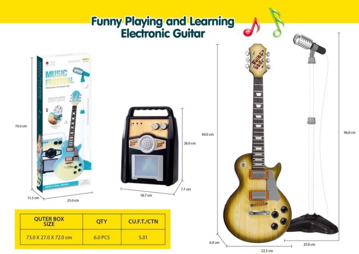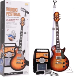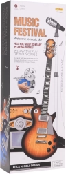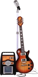 Αυτό το δημιουργικό μουσικό σετ είναι ιδανική επιλογή για παιδιά από 3 ετών. Η ηλεκτρική κιθάρα σε καφέ απόχρωση μοιάζει με αληθινό όργανο, τη συνδέετε στον ενισχυτή με το παρεχόμενο καλώδιο και το παιδί μπορεί αμέσως να αρχίσει να παίζει και να τραγουδά στο μικρόφωνο πάνω στη σταθερή βάση. Ο ενισχυτής επιτρέπει ανεξάρτητη ρύθμιση της έντασης για κιθάρα και μικρόφωνο, προσφέρει είσοδο για κιθάρα, μικρόφωνο και επίσης για εξωτερικό MP3. Την ατμόσφαιρα ολοκληρώνουν τα πολύχρωμα φωτάκια που αναβοσβήνουν στο ρυθμό.
