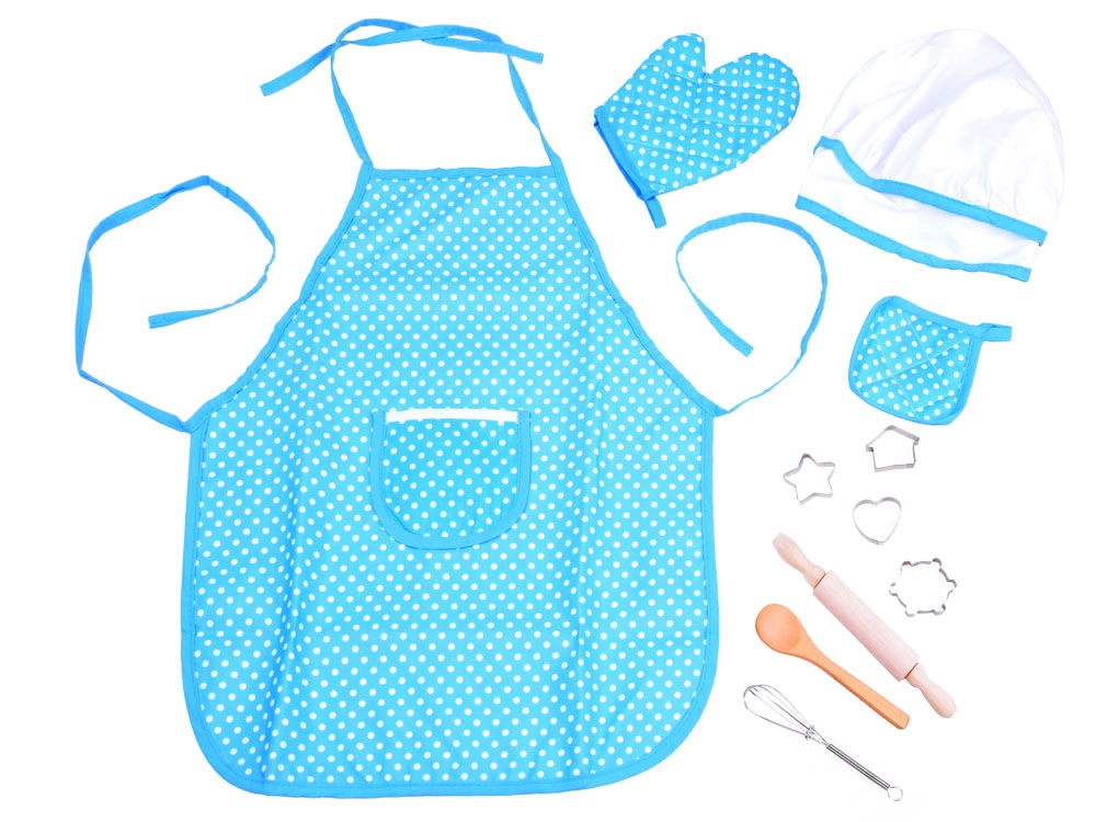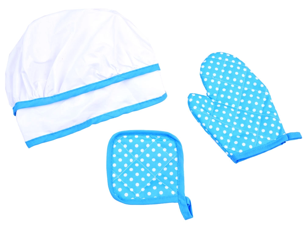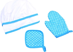 Σκούφος με λάστιχο, ποδιά με τσέπη και θερμικό γάντι με υποστήριγμα προστατεύουν ρούχα και χέρια, ενώ τα παιδιά νιώθουν σαν αληθινοί μάγειρες.