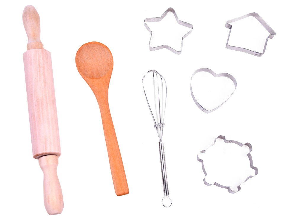 Ξύλινος πλάστης και κουτάλα, μεταλλικός αυγοδάρτης και 4 μεταλλικά κουπ πατ (καρδιά, αστέρι, λουλούδι κ.ά.) για σχηματισμό και προετοιμασία ζύμης.