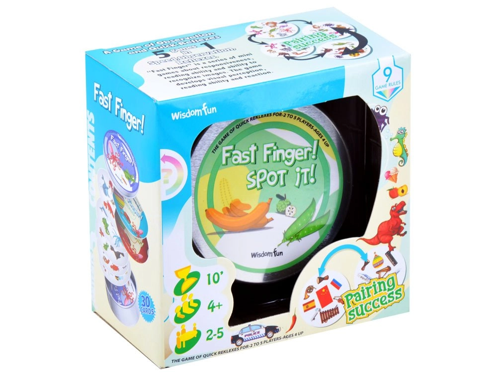 Στη συσκευασία υπάρχουν 30 ανθεκτικές κάρτες και αρκετές παραλλαγές παιχνιδιού που θα δοκιμάσουν τα αντανακλαστικά, την παρατηρητικότητα στη λεπτομέρεια και τη μνήμη σας. Τα σύμβολα διαφέρουν σε μέγεθος και προσανατολισμό, ώστε το παιχνίδι να μη σταματά να σας εκπλήσσει.