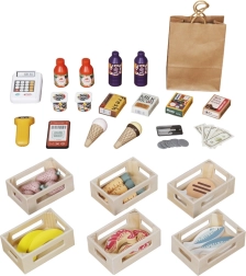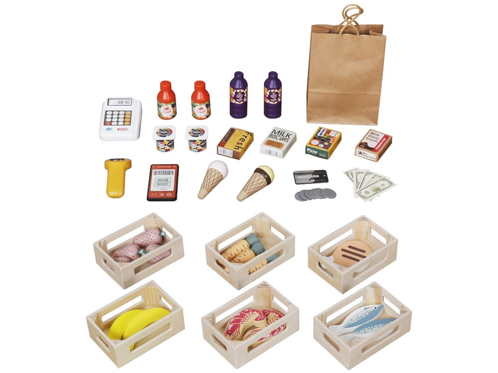 Το σετ περιλαμβάνει ταμειακή με τερματικό πληρωμών, σαρωτή, παιχνίδια-χρήματα, ξύλινα κασόνια με τρόφιμα, χάρτινη τσάντα, κουδουνάκι και διακοσμητικά αυτοκόλλητα. Τα παιδιά κατακτούν βασικές αρχές αρίθμησης, χρηματοοικονομικού γραμματισμού και συνεργασίας, ενώ εξασκούν γραφή και ανάγνωση στις πινακίδες κιμωλίας.