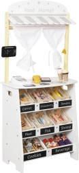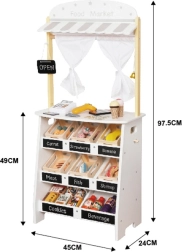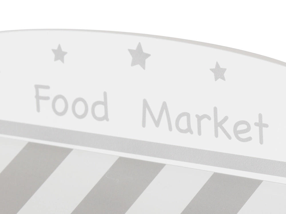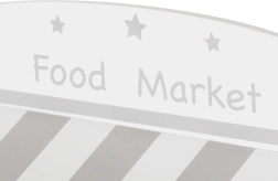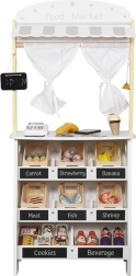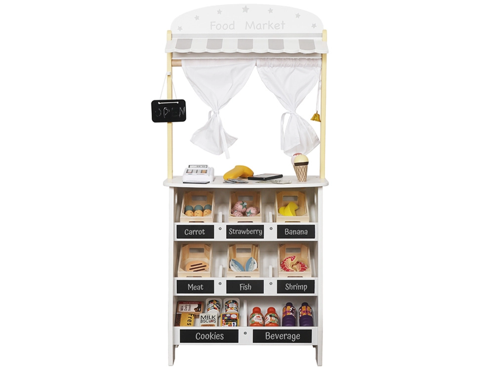 Ο ξύλινος πάγκος με τέντα και θήκες για τρόφιμα προσφέρει στα παιδιά αυθεντική εμπειρία αγορών: ταξινόμηση φρούτων και λαχανικών, γραφή με κιμωλία στις πινακίδες και χτύπημα προϊόντων στην ταμειακή με σαρωτή. Με περιστροφή ή κλείσιμο των πλευρικών τοιχωμάτων μετατρέπεται σε χαριτωμένο θεατράκι με αυλαία – ιδανικό για τις πρώτες ιστορίες και παραστάσεις.