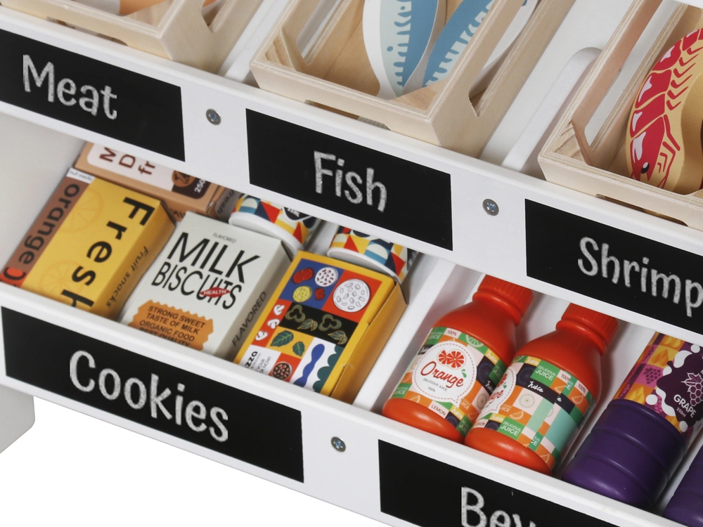 Τακτοποιημένα χωρίσματα για φρούτα, λαχανικά, αρτοσκευάσματα και ποτά, καθώς και πινακίδες κιμωλίας για τιμές και σημειώσεις, υποστηρίζουν την οργάνωση και τα πρώτα μαθηματικά.