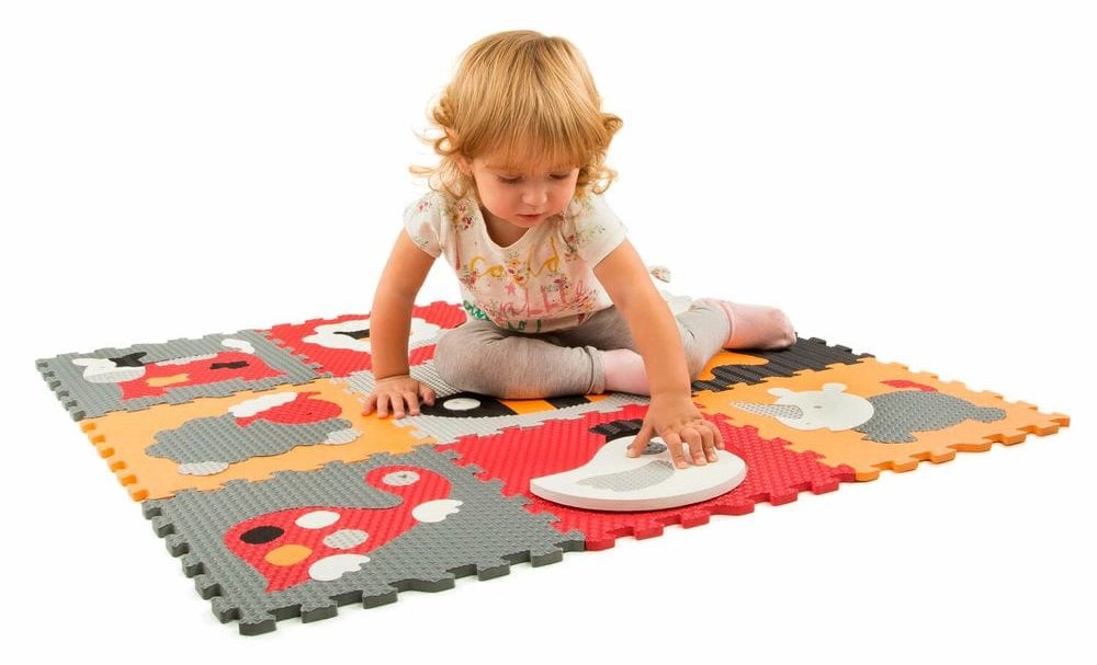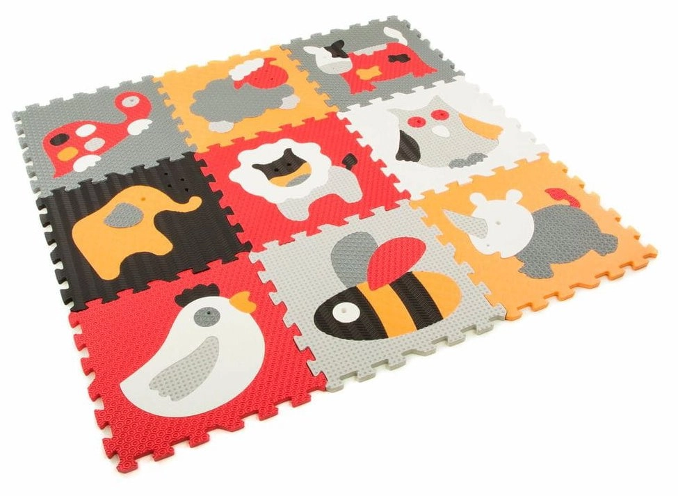 Αφρώδες παζλ με ζωικά μοτίβα σε συνδυασμό γκρι και κόκκινου, ιδανική επιλογή ως χαλάκι παιχνιδιού για παιδικό δωμάτιο ή σαλόνι. Κάθε εικόνα αποτελείται από πέντε έως οκτώ αποσπώμενα κομμάτια, ώστε τα παιδιά να εξασκούν τη λεπτή κινητικότητα και τη λογική σκέψη. Η επιφάνεια είναι μαλακή, ασφαλής, εύκολη στη συντήρηση και χάρη στις μονωτικές ιδιότητες προστατεύει από το κρύο του δαπέδου.