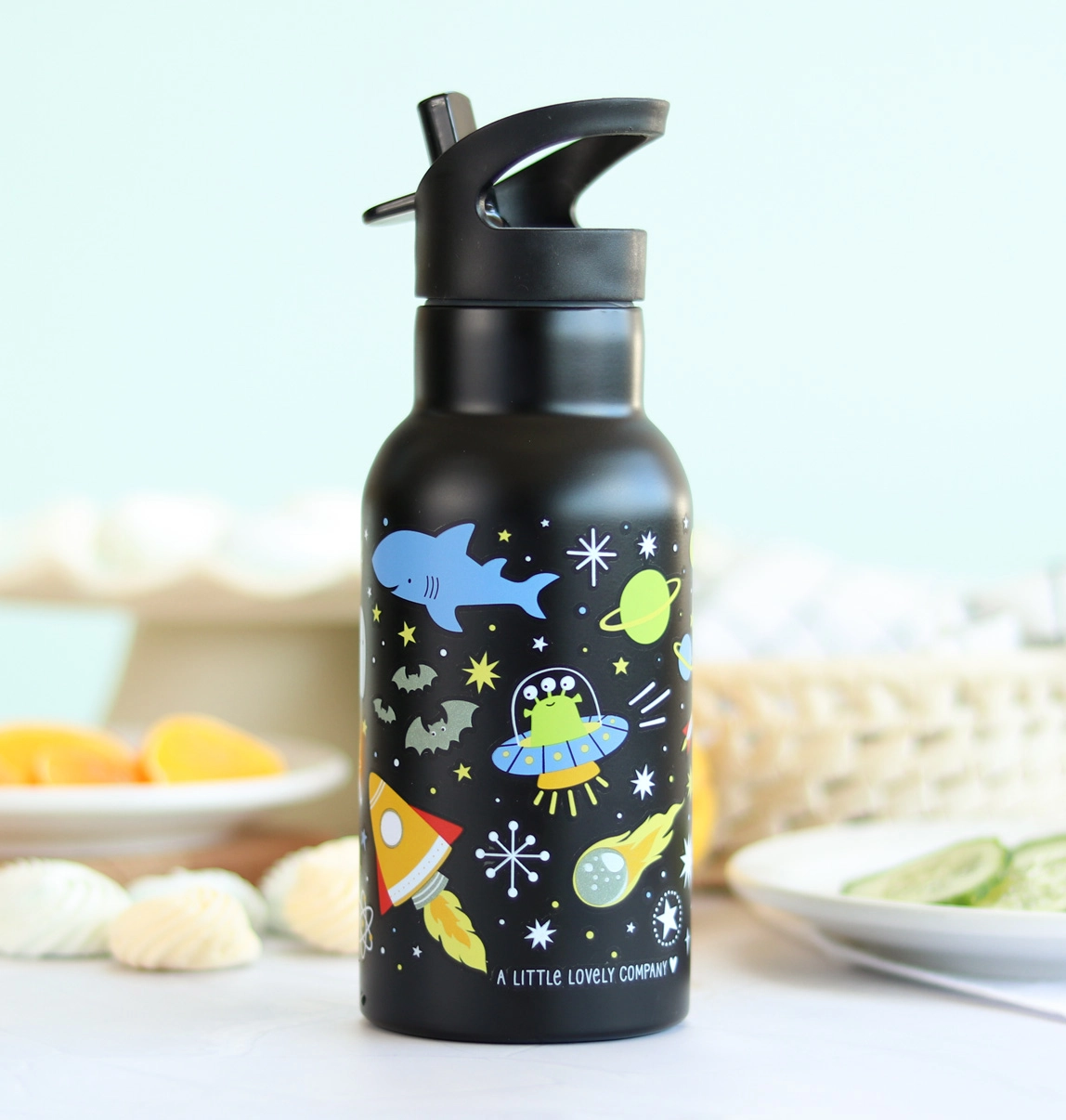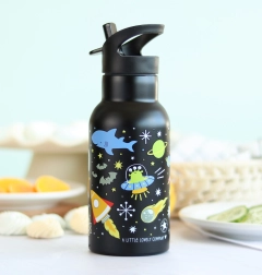 Το σώμα από ανοξείδωτο ατσάλι αντέχει στην καθημερινή χρήση, ενώ η πολύχρωμη εκτύπωση με πλανήτες και πυραύλους ενθουσιάζει τα παιδιά.