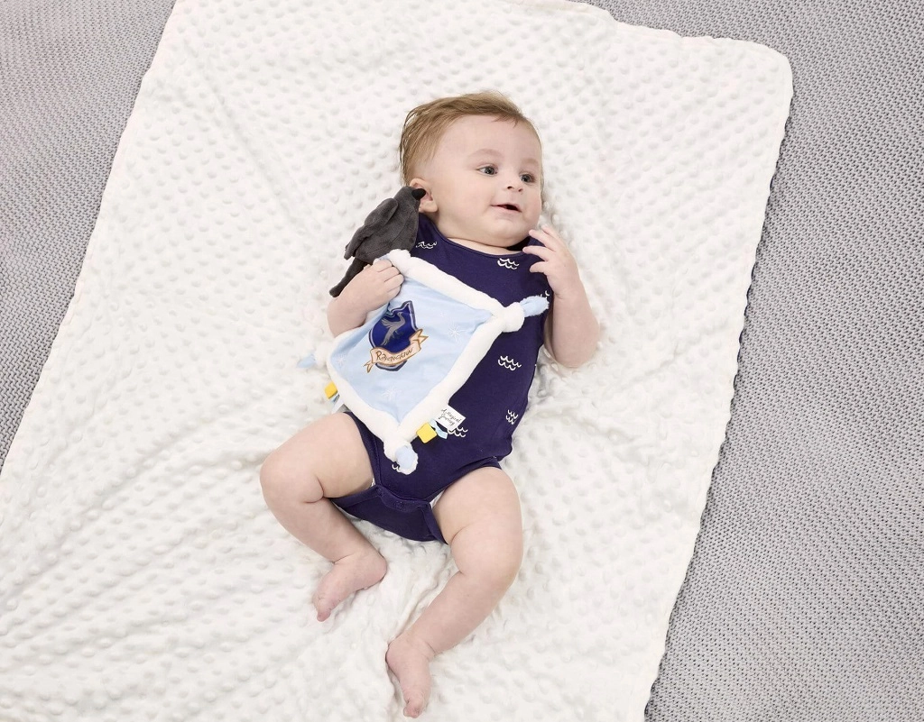 Ανακαλύψτε τη μαγεία της καταπραϋντικής αφής. Το κουβερτάκι παρηγοριάς HARRY POTTER Ράβενκλοου είναι φτιαγμένο από υπερ-απαλό λούτρινο και διακοσμημένο με το έμβλημα του Ράβενκλοου και διακριτικές λεπτομέρειες που τα παιδιά θα αγαπήσουν. Είναι ασφαλές για τα νεογέννητα και τέλειο για αγκαλιές στο σπίτι και στο ταξίδι.
