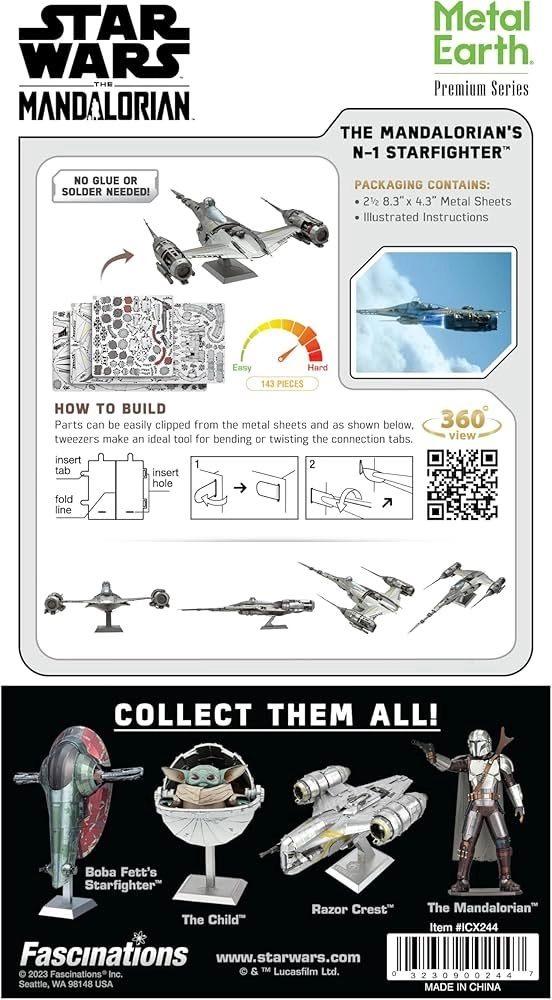 Αυτό το premium σετ επιτρέπει σε θαυμαστές του MANDALORIAN και μοντελιστές να κατασκευάσουν πιστή ρέπλικα του θρυλικού N‑1 Starfighter. Από τετράγωνα χαλύβδινα φύλλα διαμορφώνετε και συναρμολογείτε τα μέρη σε ένα εντυπωσιακό μεταλλικό μοντέλο με λεπτή χάραξη laser, που αντιγράφει πιστά την αυθεντική εμφάνιση του σκάφους.