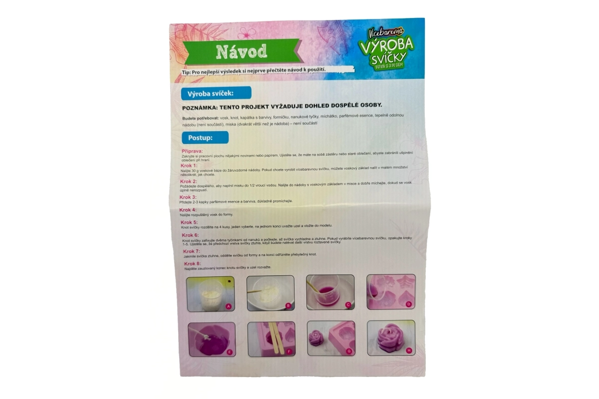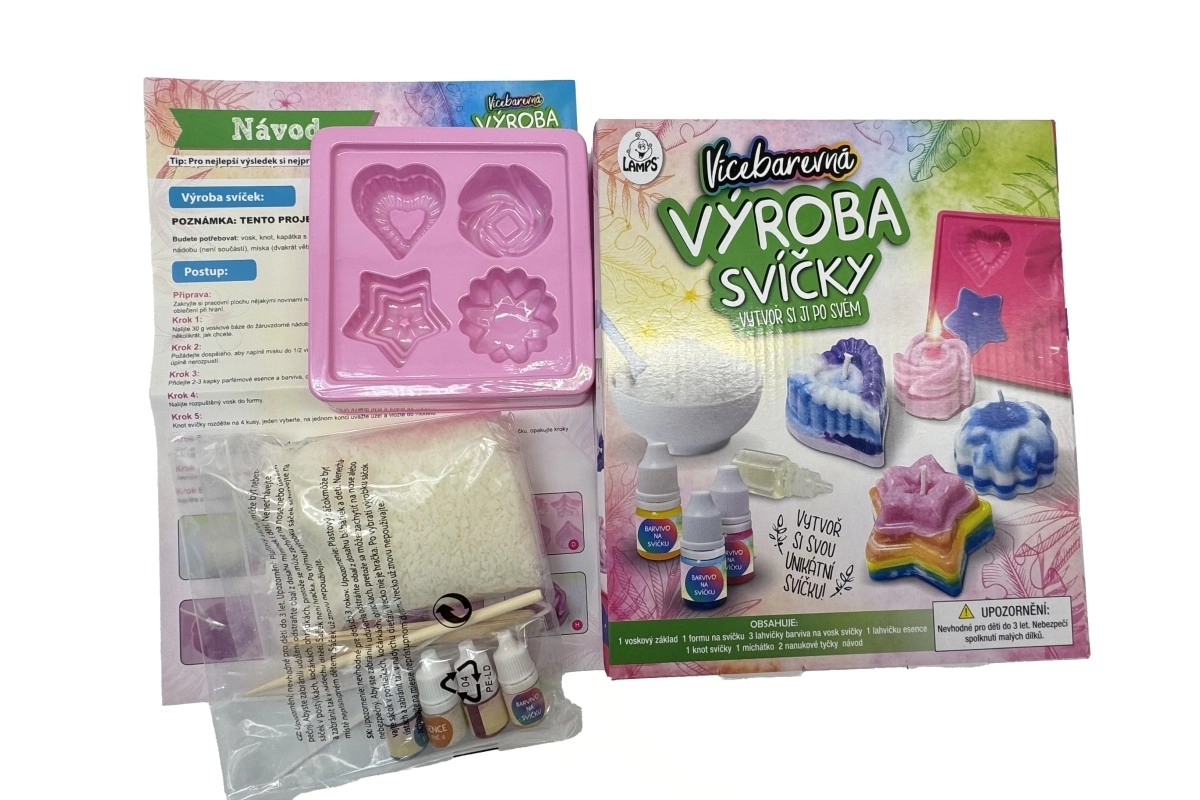 Στη συσκευασία θα βρείτε ό,τι χρειάζεται – από το κερί και το φιτίλι μέχρι το καλούπι, το χρώμα και το άρωμα. Πρακτικά βοηθήματα όπως ο αναδευτήρας και τα ξυλάκια παγωτού διευκολύνουν την εργασία και διατηρούν την τάξη κατά τη δημιουργία. Διαστάσεις συσκευασίας περίπου 20 × 23 × 5 εκ., ιδανικό και ως δώρο.