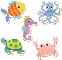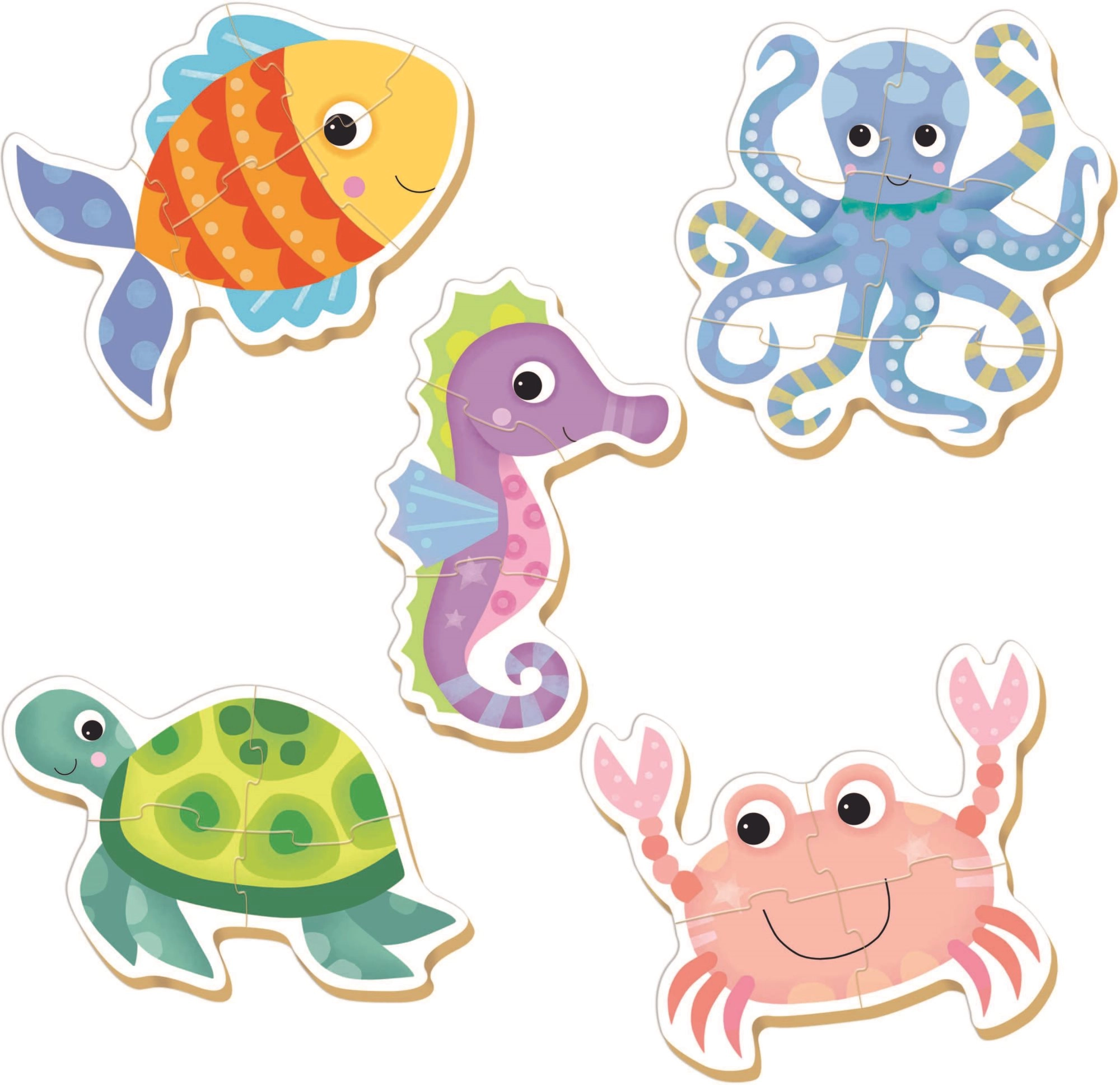 Ψαράκι, χταπόδι, ιππόκαμπος, χελώνα και καβούρι σε ζωηρά χρώματα τραβούν την προσοχή και παρακινούν στο παιχνίδι με παζλ.