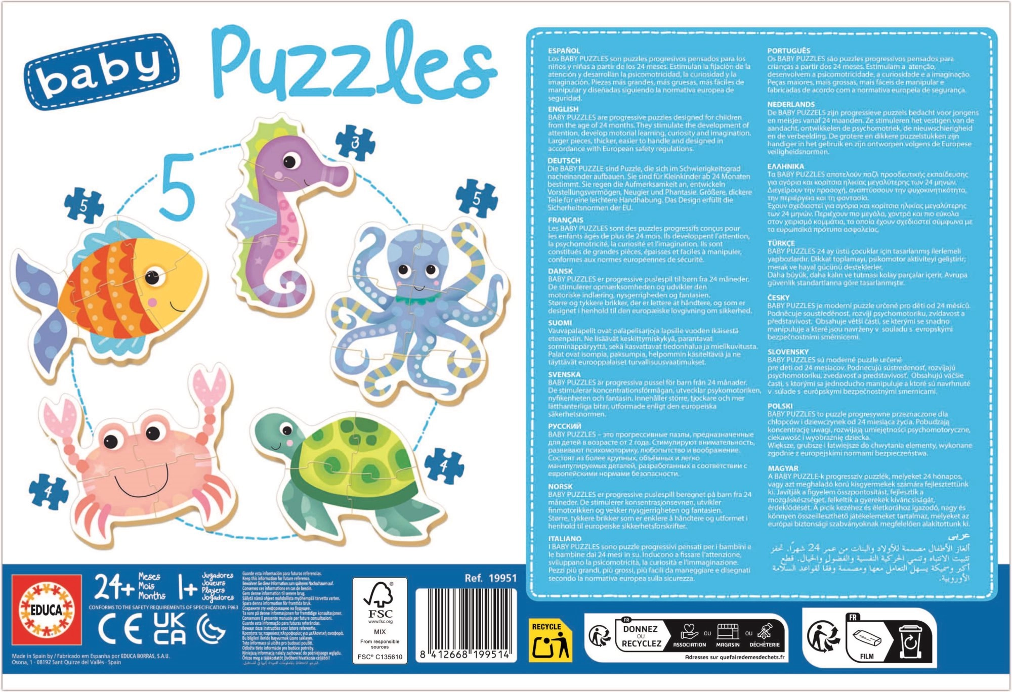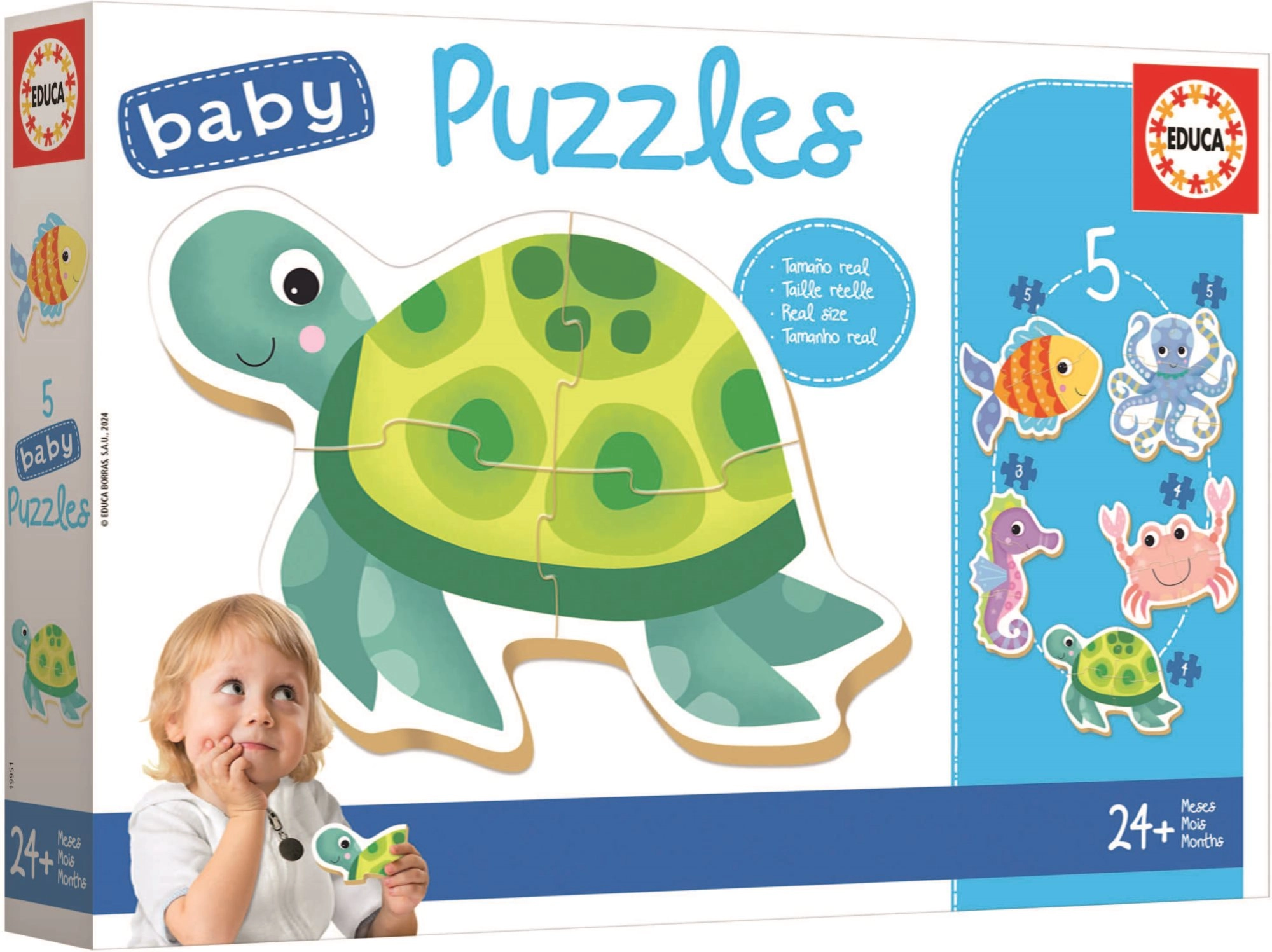 Τα baby puzzle EDUCA Θαλάσσια ζώα 5v1 έχουν σχεδιαστεί ειδικά για τους μικρότερους. Υποστηρίζουν τον ψυχοκινητικό τρόπο ανάπτυξης, τον συντονισμό χεριού–ματιού καθώς και την υπομονή και τη λογική σκέψη. Η συναρμολογημένη εικόνα έχει περίπου 15 × 15 cm, ιδανικό μέγεθος για μικρά χέρια και πρώτες επιτυχίες.