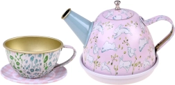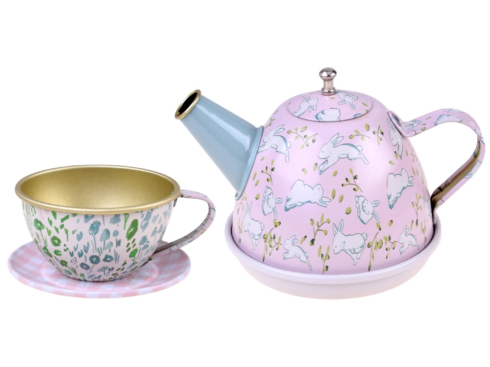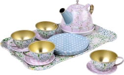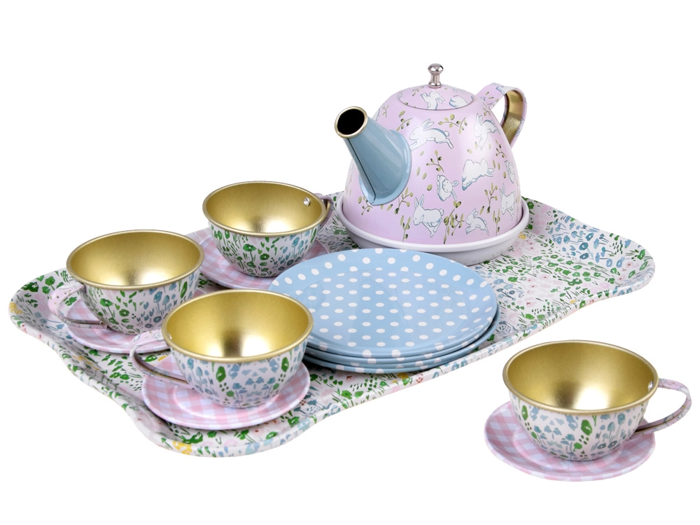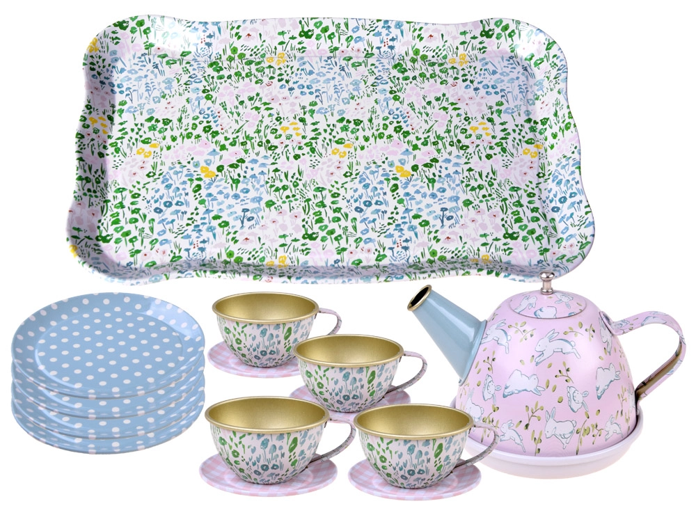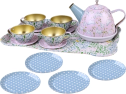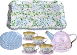 Δίσκος, τσαγιέρα, 4 φλιτζάνια με πιατάκια και 4 πιατάκια σερβιρίσματος – όλα ταιριασμένα σε παιχνιδιάρικο σχέδιο για χαρά σε κάθε πάρτι τσαγιού.