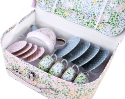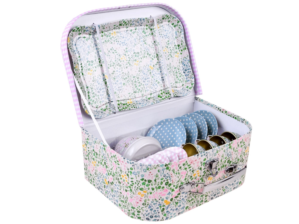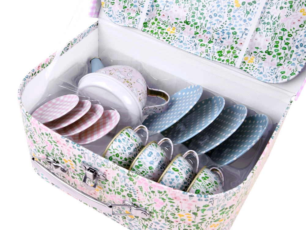 Ένα μαγικό παιδικό σετ τσαγιού σε πρακτικό βαλιτσάκι προσφέρει ώρες δημιουργικού παιχνιδιού και δραστηριοτήτων ρόλων. Τα ελαφριά και ανθεκτικά μεταλλικά σκεύη μιμούνται με ασφάλεια ένα πραγματικό σερβίτσιο – ιδανικό για τσάι με κούκλες και λούτρινα. Το σετ περιλαμβάνει τσάιέρα, δίσκο, 4 φλιτζάνια με πιατάκια και 4 πιατάκια σερβιρίσματος, ώστε τα παιδιά να απολαμβάνουν το κοινό σερβίρισμα όπως οι μεγάλοι.