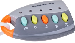 Πολύχρωμα κουμπιά παίζουν χαρούμενες μελωδίες και ήχους αυτοκινήτου – κουδούνισμα, κόρνα, εκκίνηση κινητήρα και κλείδωμα/ξεκλείδωμα. Τα παιδιά μαθαίνουν αιτία–αποτέλεσμα με διασκεδαστικό τρόπο.