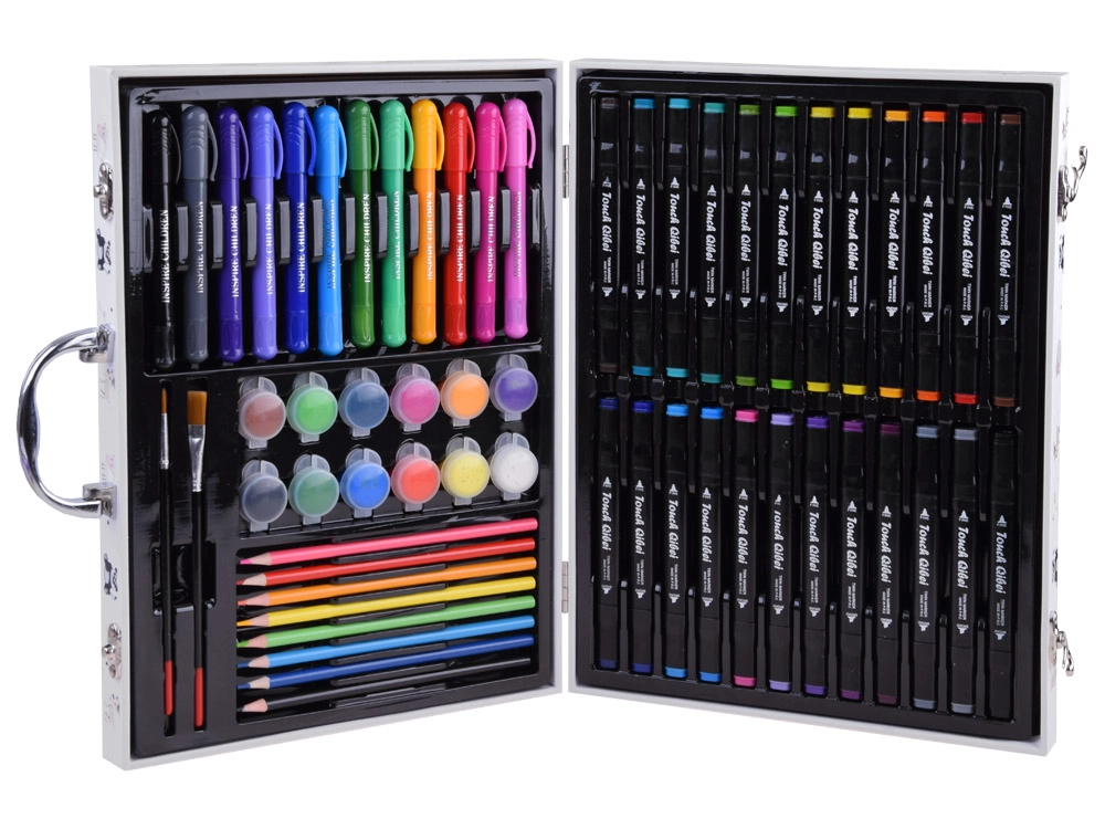 Το σετ συνδυάζει ξυλομπογιές, ακουαρέλες, χοντρούς και λεπτούς μαρκαδόρους και πινέλα – ιδανικά για σκίτσο, χρωμάτισμα και ζωγραφική.