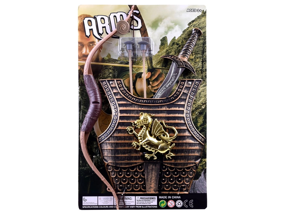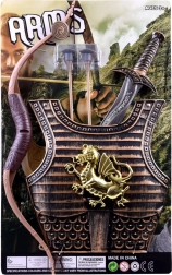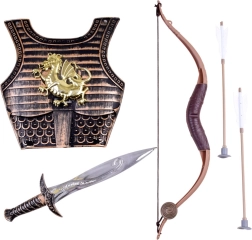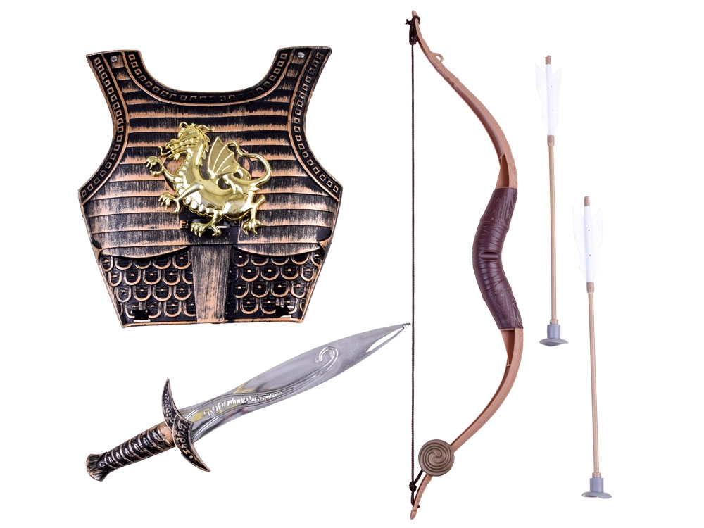 Το σετ περιλαμβάνει πανοπλία, τόξο, δύο βέλη και σπαθί — ιδανικός συνδυασμός για φανταστικές μάχες και καρναβαλικές στολές.