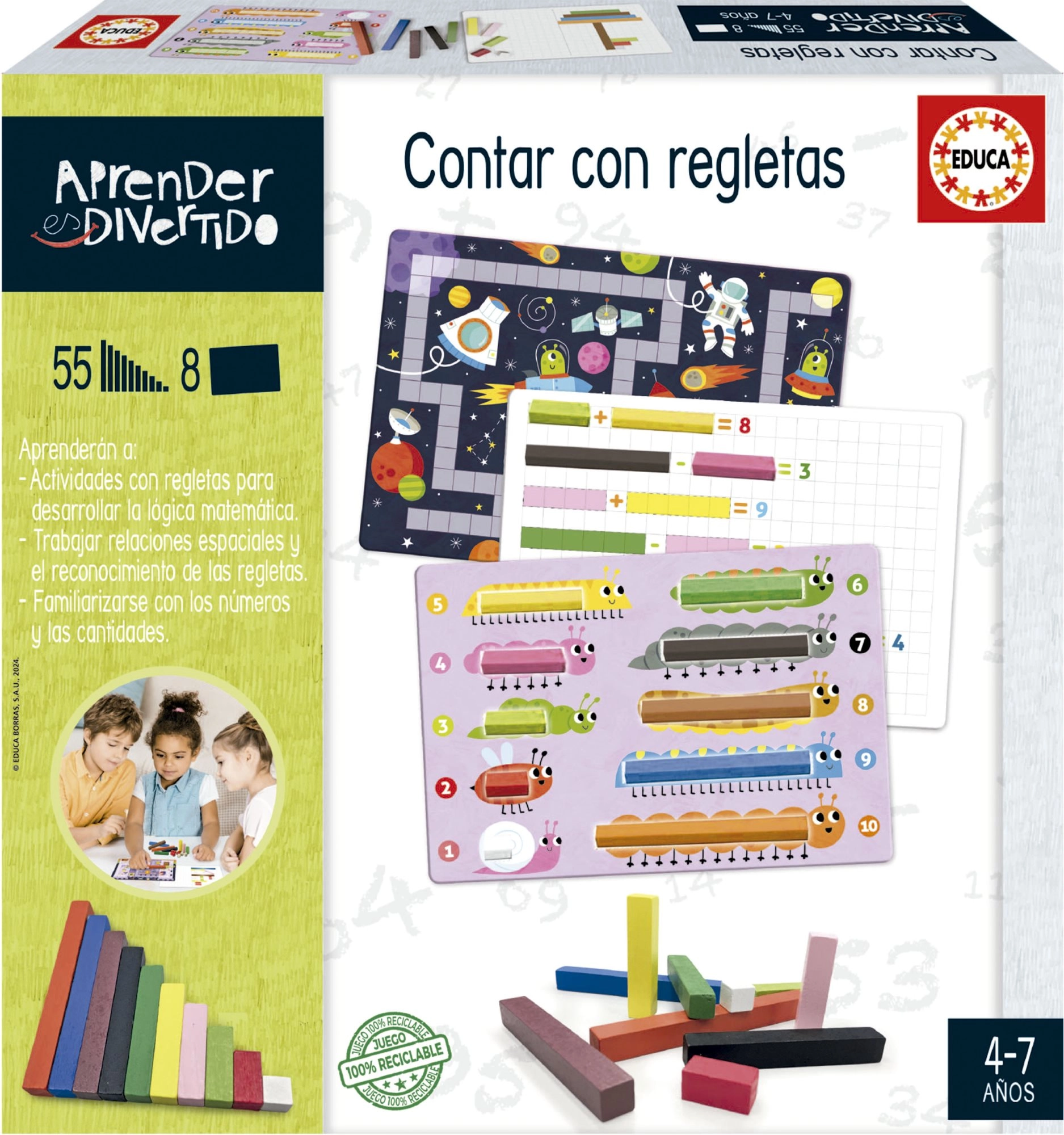 Ένα διασκεδαστικό εκπαιδευτικό παιχνίδι της EDUCA που βοηθά τα παιδιά, με παιχνιδιάρικο τρόπο, να αναπτύξουν τις μαθηματικές δεξιότητες, την κατανόηση των αριθμών και των αναλογιών και ενισχύει τη λογική σκέψη και την αυτοπεποίθησή τους. Χάρη στις δραστηριότητες και στις δύο πλευρές των καρτών και στα πολύχρωμα τουβλάκια, η μάθηση γίνεται παιχνίδι.