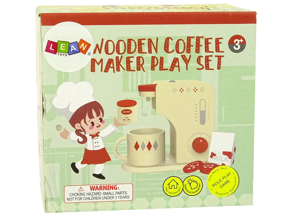Η ξύλινη παιδική καφετιέρα σε κομψό μπεζ-κόκκινο συνδυασμό χρωμάτων θα ενθουσιάσει μικρούς barista. Χάρη στον περιστροφικό επιλογέα και την κλίμακα στο μπροστινό πάνελ, το παιχνίδι δείχνει φυσικό και ρεαλιστικό. Τα παιδιά μπορούν να «ετοιμάσουν» espresso, cappuccino ή latte, να προσθέσουν γάλα και να γλυκάνουν με ζάχαρη – όλα ακριβώς σύμφωνα με τις επιθυμίες των «πελατών».
