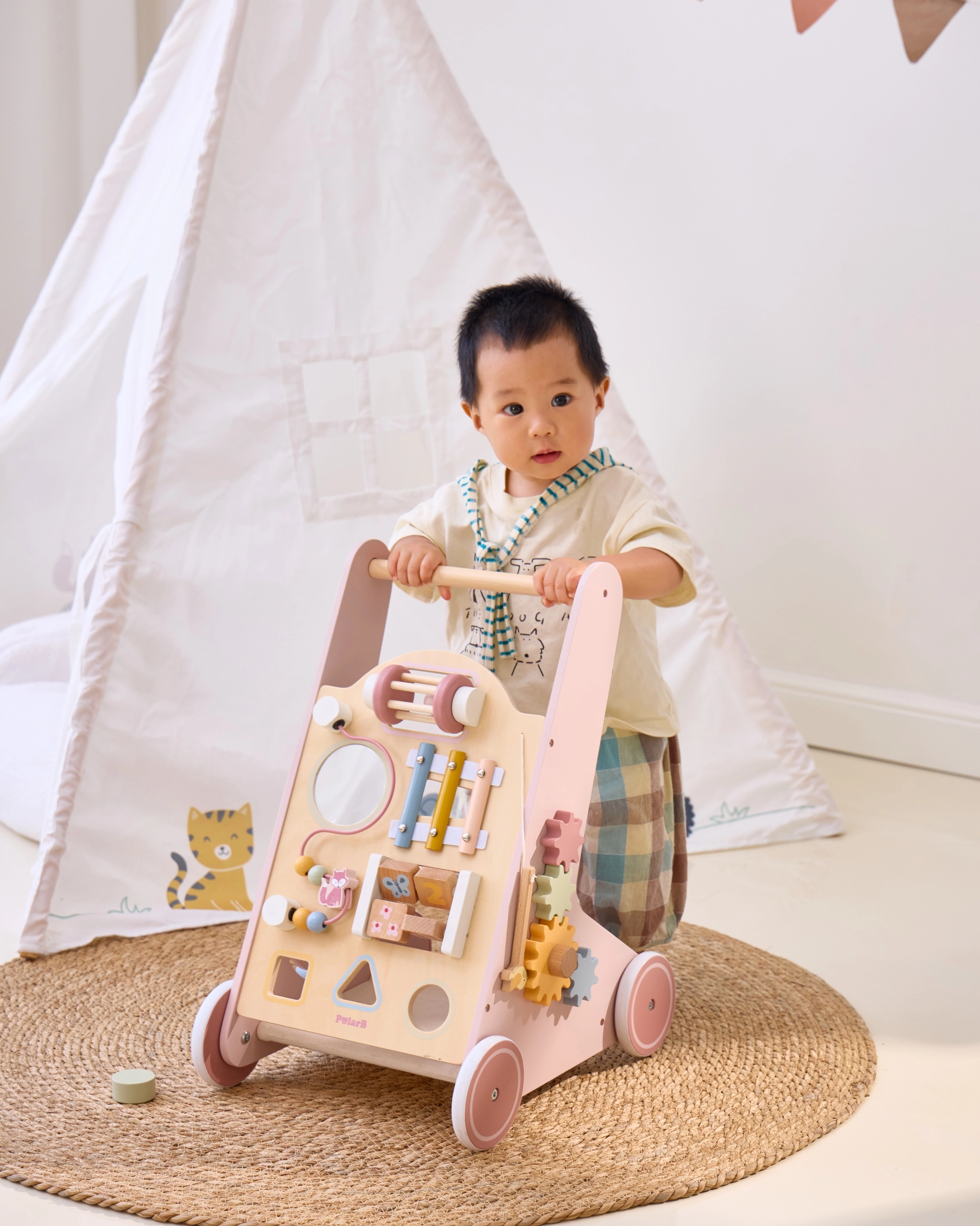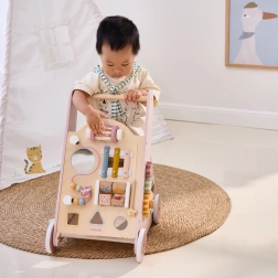 Ο περπατούρας περιλαμβάνει καθρέφτη, περιστρεφόμενους κύβους και άλλες δραστηριότητες που ενισχύουν τις κινητικές και γνωστικές δεξιότητες.