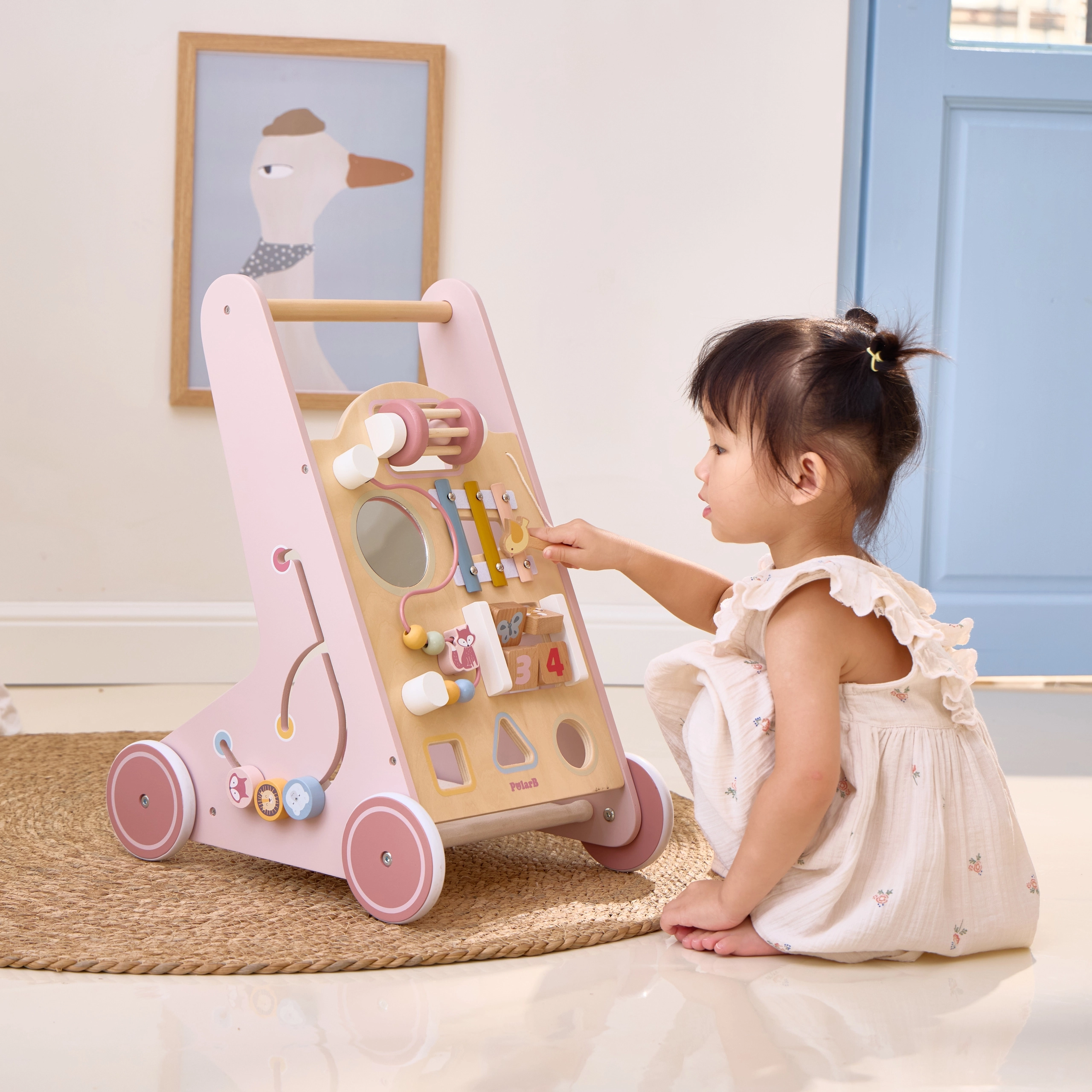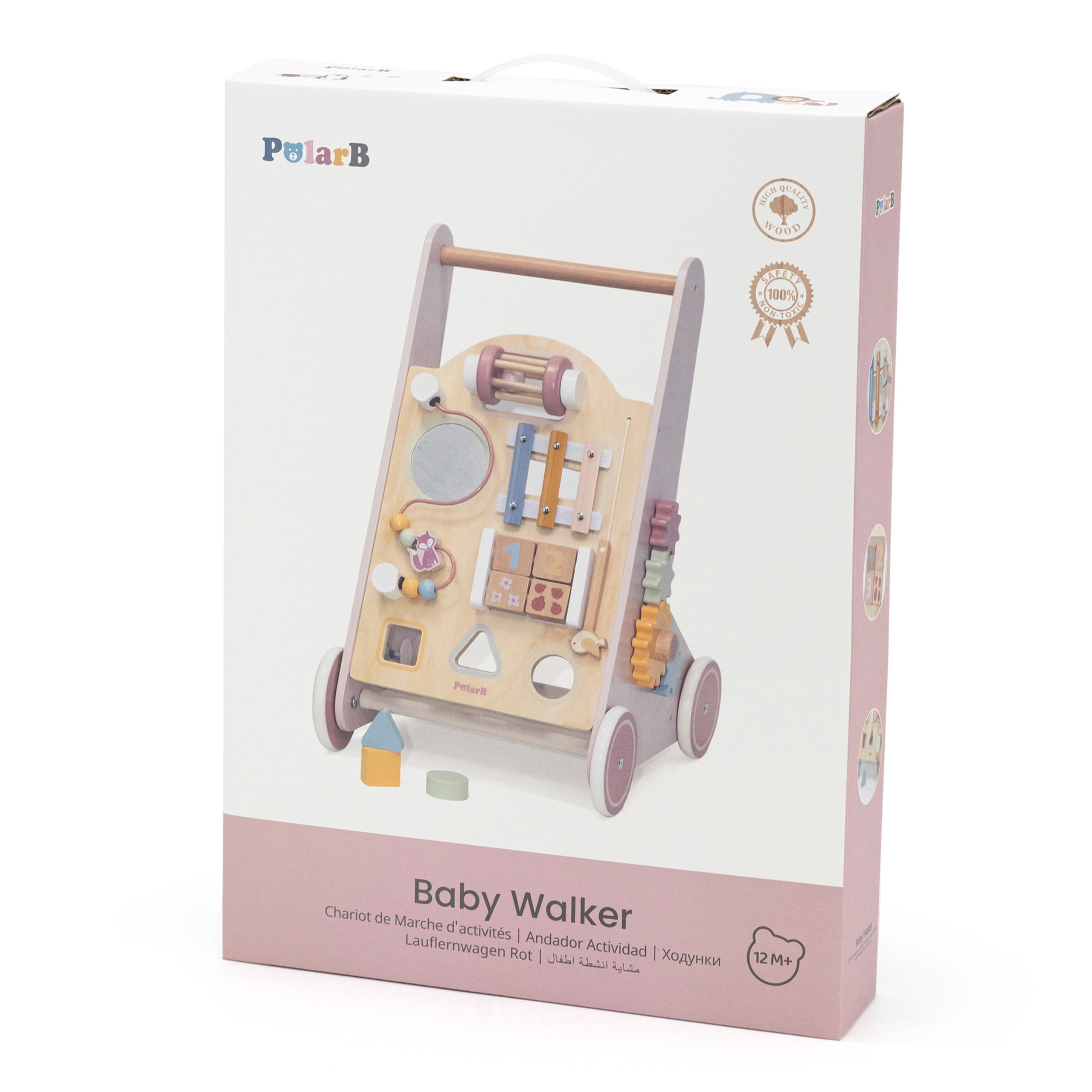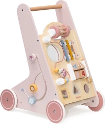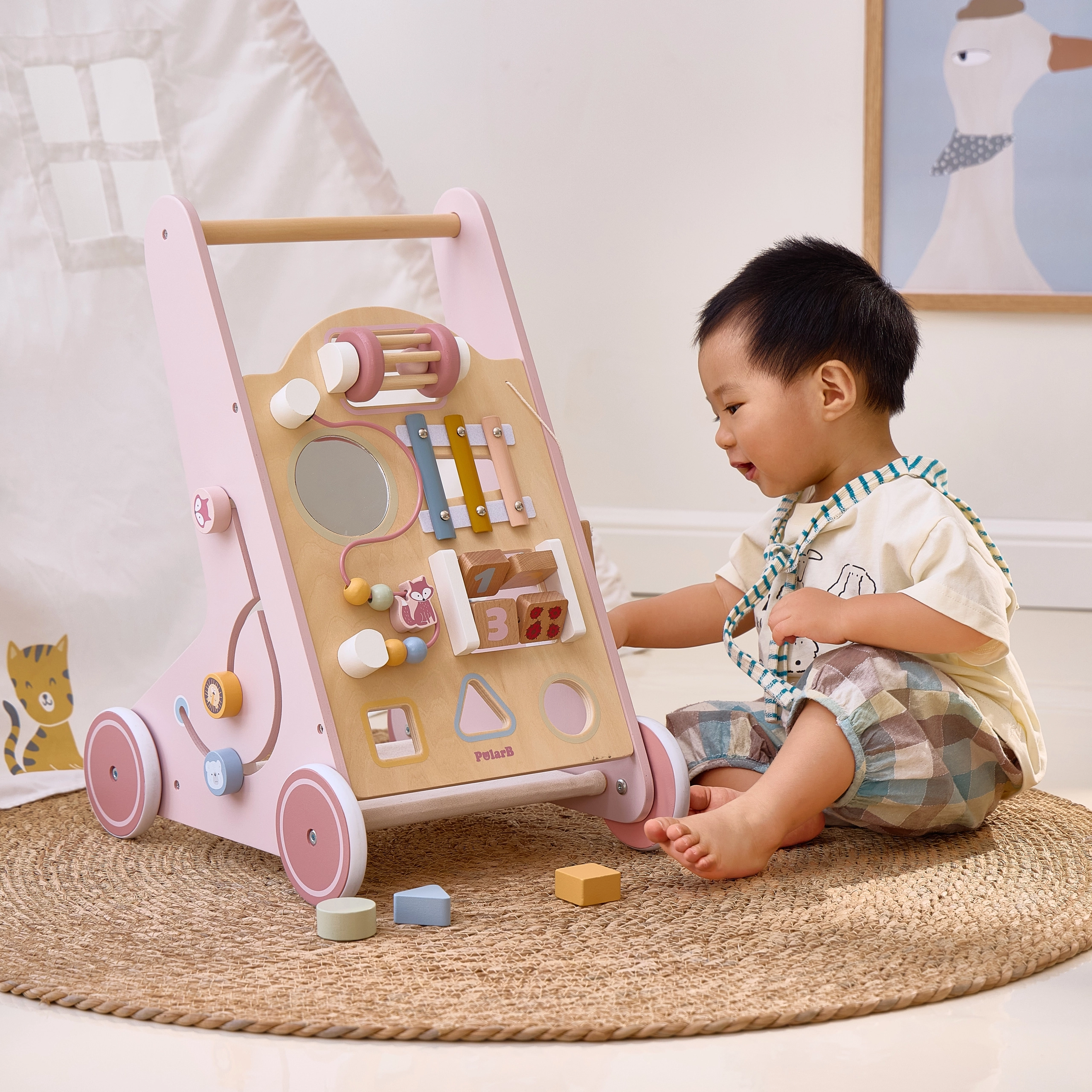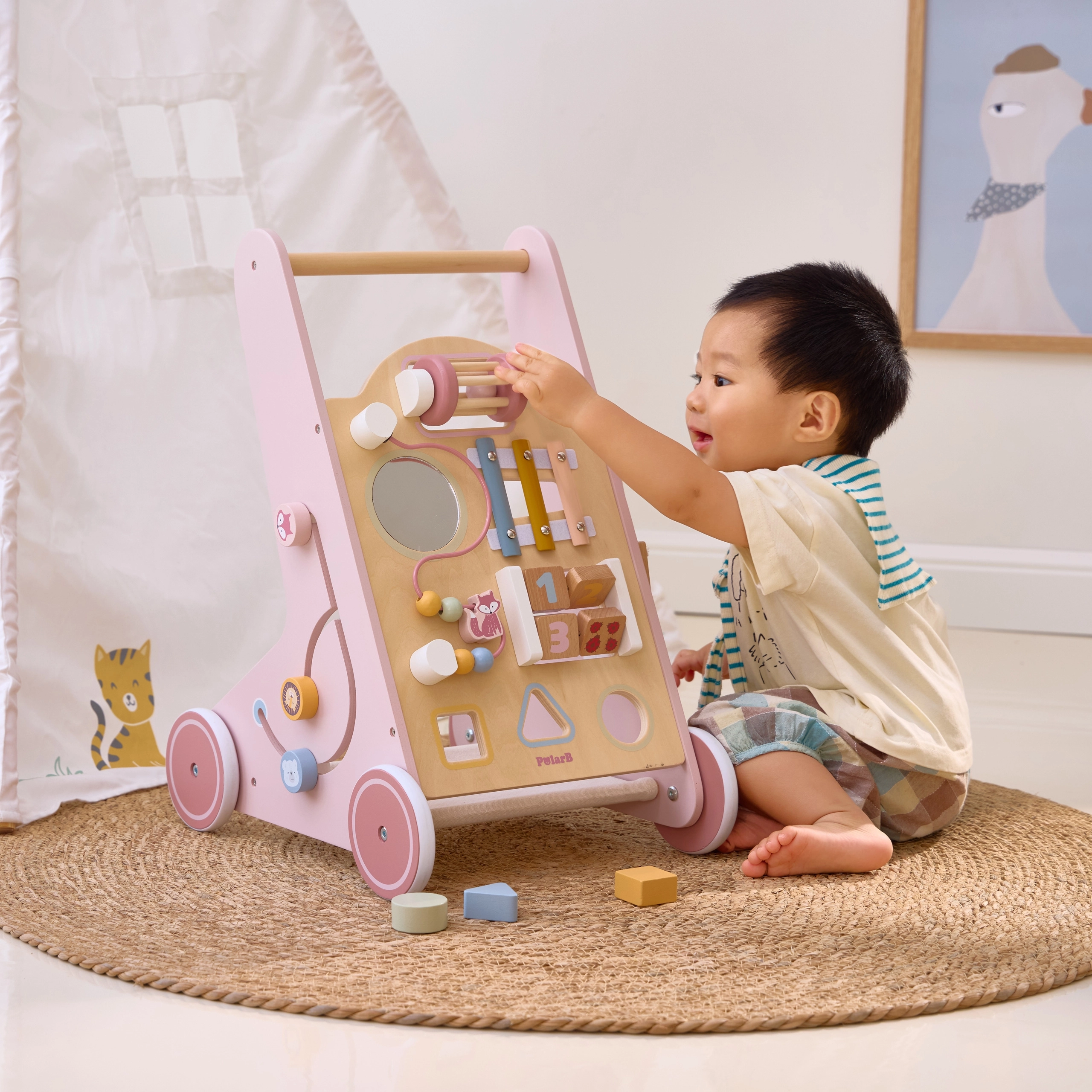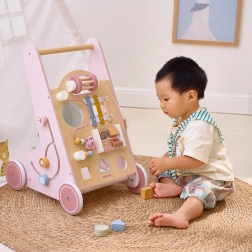 Σας παρουσιάζουμε τον Ξύλινο περπατούρα για νήπια PolarB σε ροζ χρώμα, σχεδιασμένο για παιδιά από 18 μηνών. Συνδυάζει διασκεδαστικές δραστηριότητες όπως παρατήρηση στον καθρέφτη, περιστρεφόμενους κύβους, λαμπερές χάντρες, ταξινόμηση σχημάτων και παιχνίδι σε ξυλόφωνο. Με αυτόν τον περπατούρα, τα παιδιά σας θα εξερευνούν με ασφάλεια τον κόσμο γύρω τους.