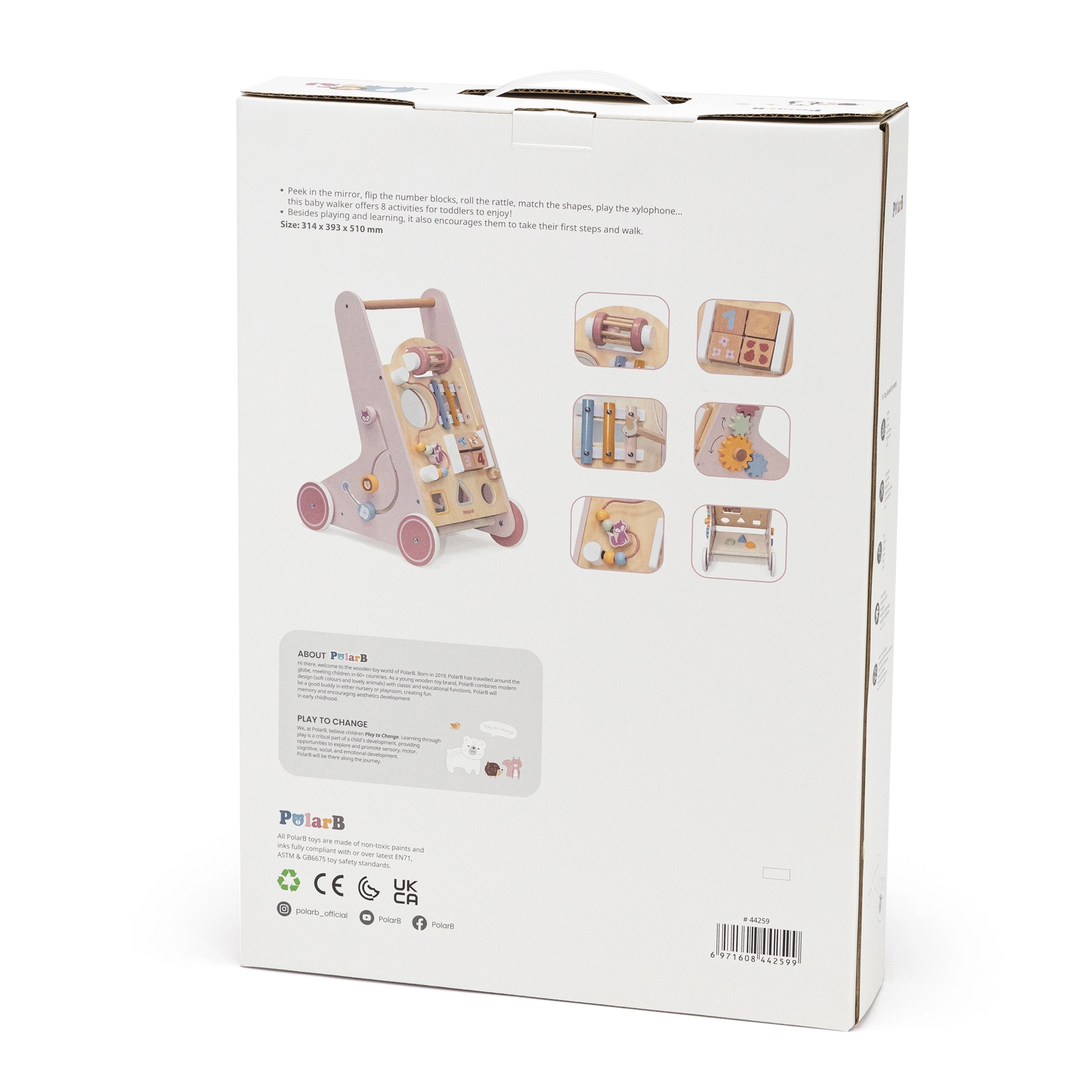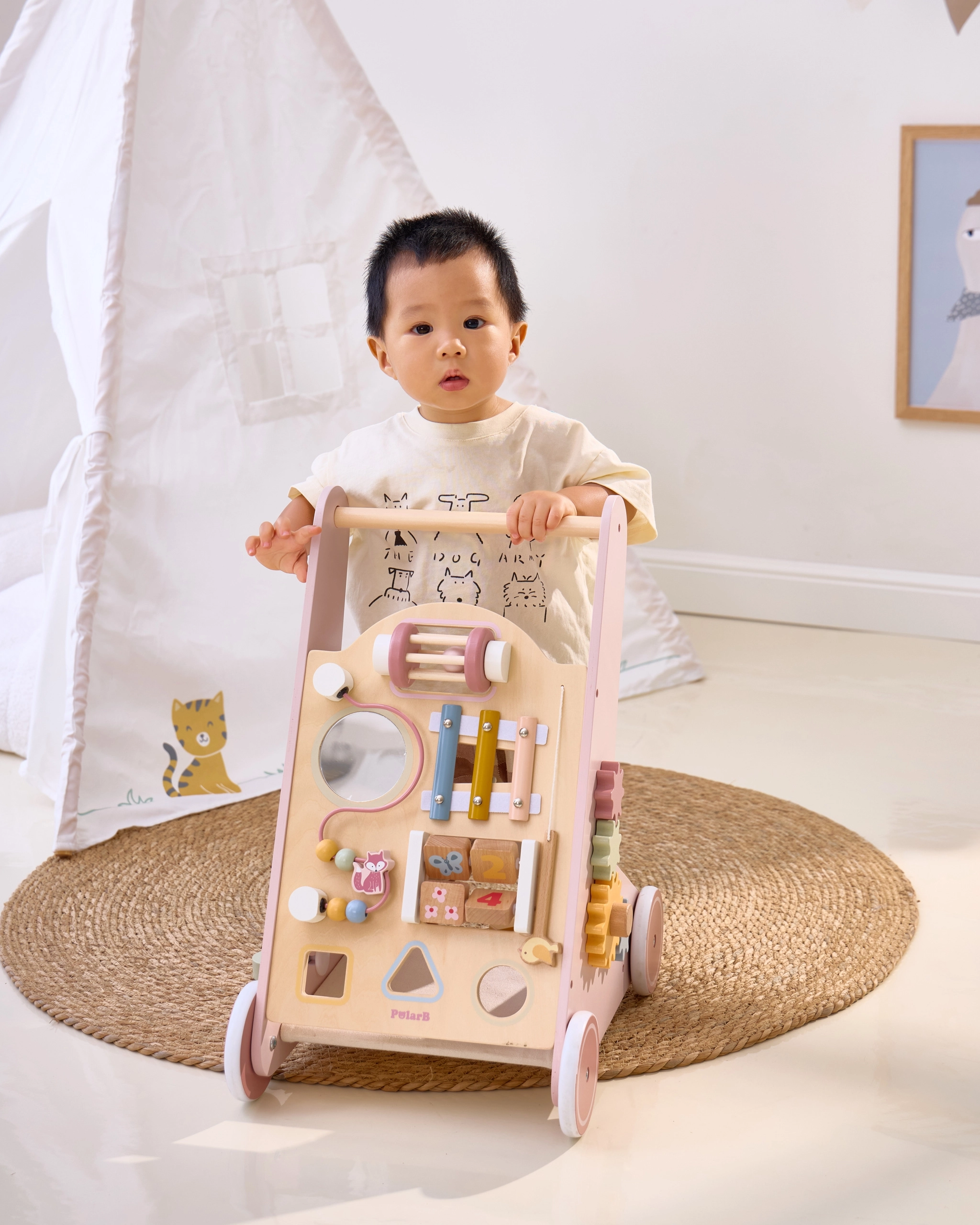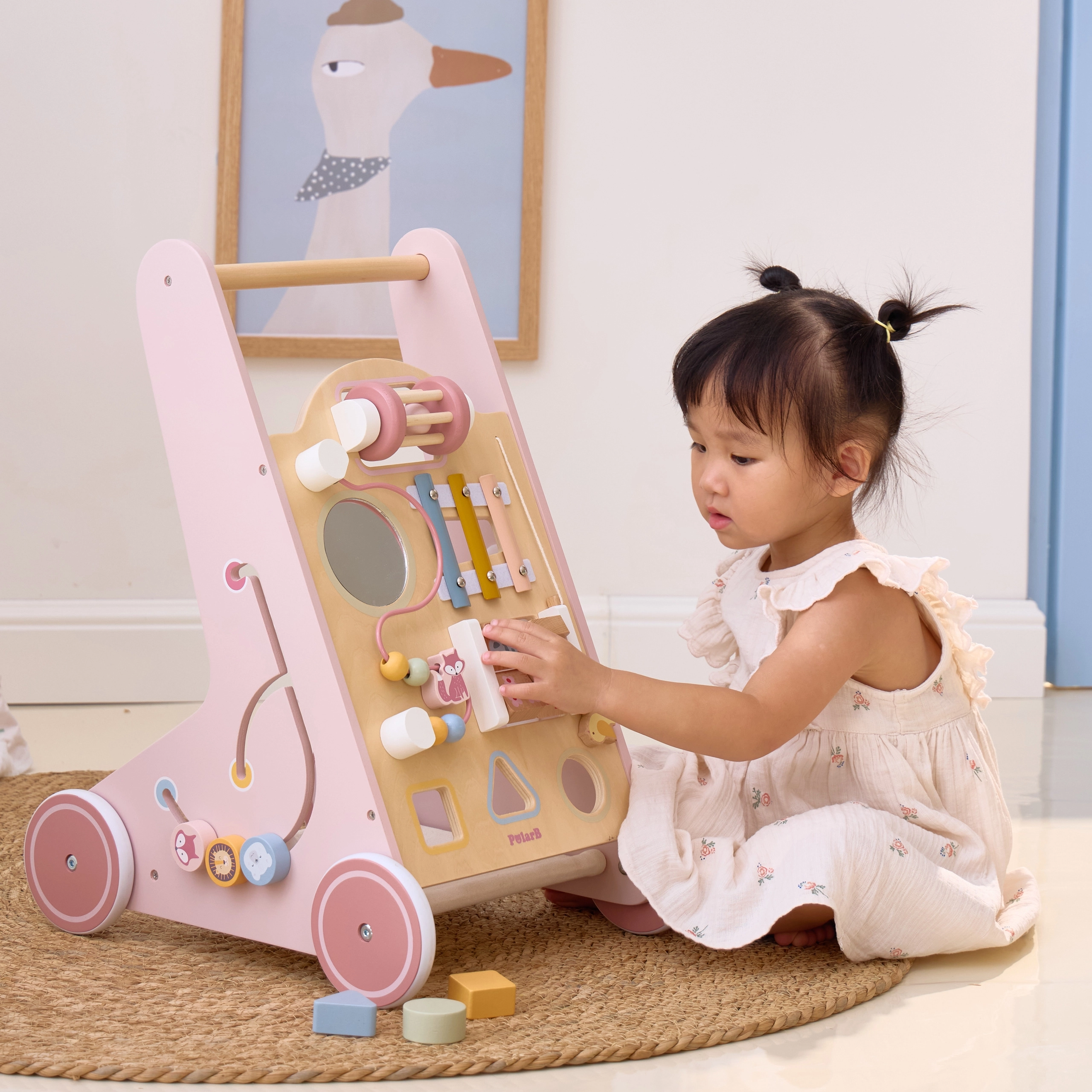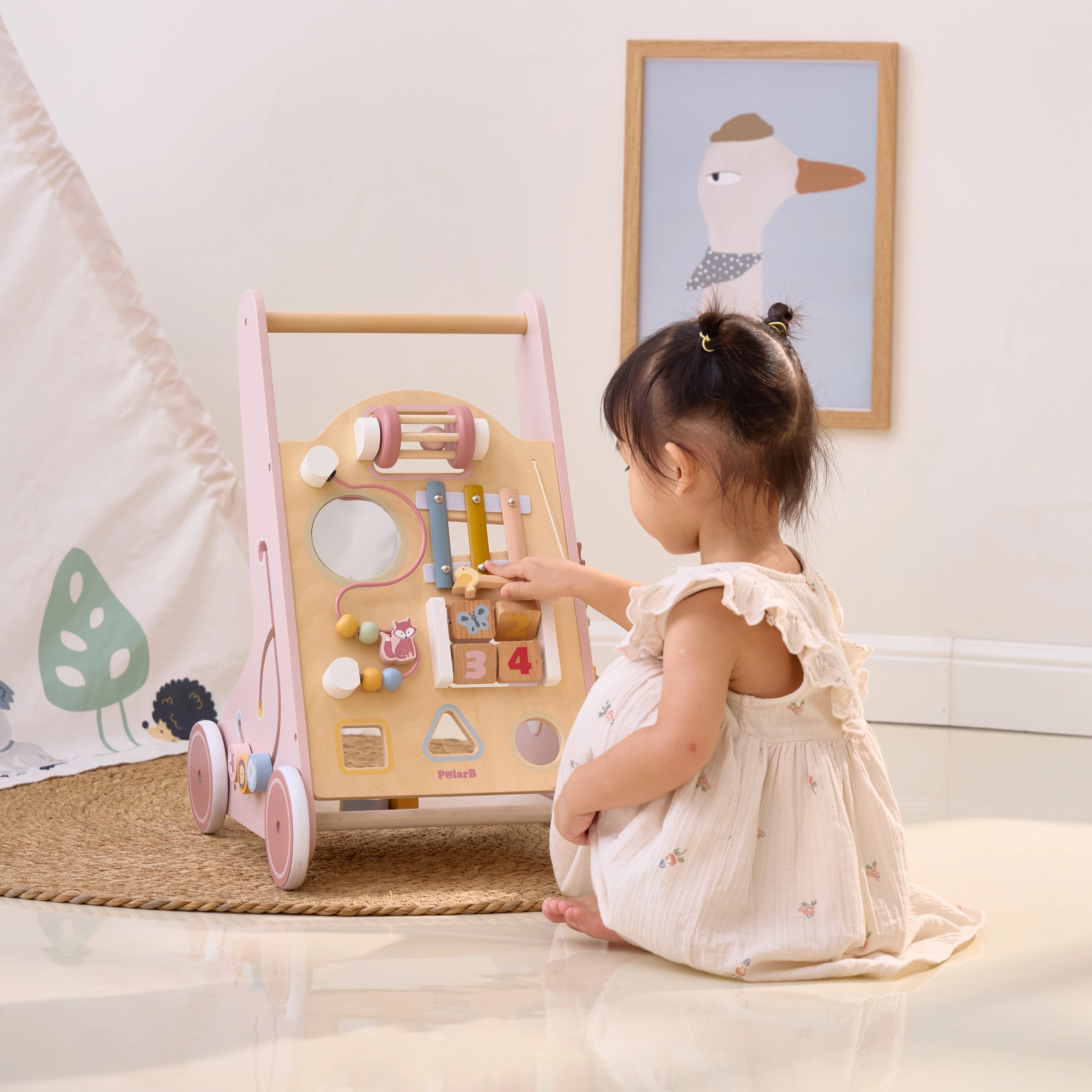 Σας παρουσιάζουμε τον Ξύλινο περπατούρα για νήπια PolarB σε ροζ χρώμα, σχεδιασμένο για παιδιά από 18 μηνών. Συνδυάζει διασκεδαστικές δραστηριότητες όπως παρατήρηση στον καθρέφτη, περιστρεφόμενους κύβους, λαμπερές χάντρες, ταξινόμηση σχημάτων και παιχνίδι σε ξυλόφωνο. Με αυτόν τον περπατούρα, τα παιδιά σας θα εξερευνούν με ασφάλεια τον κόσμο γύρω τους.