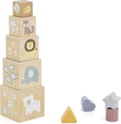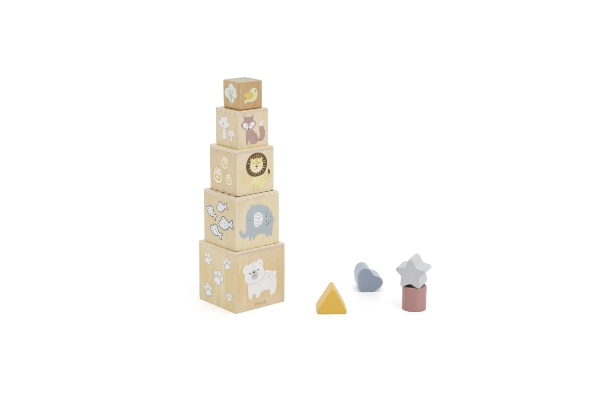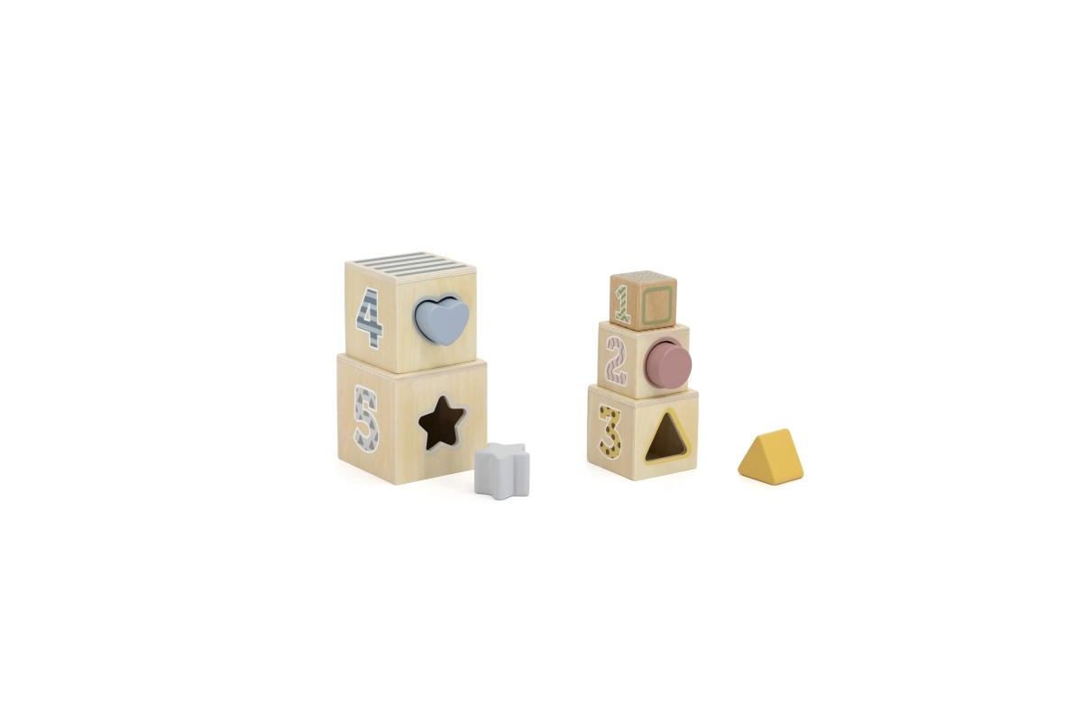 Πέντε κύβοι και αντίστοιχα σχήματα βοηθούν τα παιδιά να κατανοήσουν το μέγεθος, τους αριθμούς και την τρισδιάστατη αντίληψη. Το σετ υποστηρίζει τη λογική σκέψη και τη λεπτή κινητικότητα.