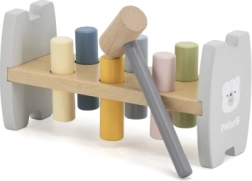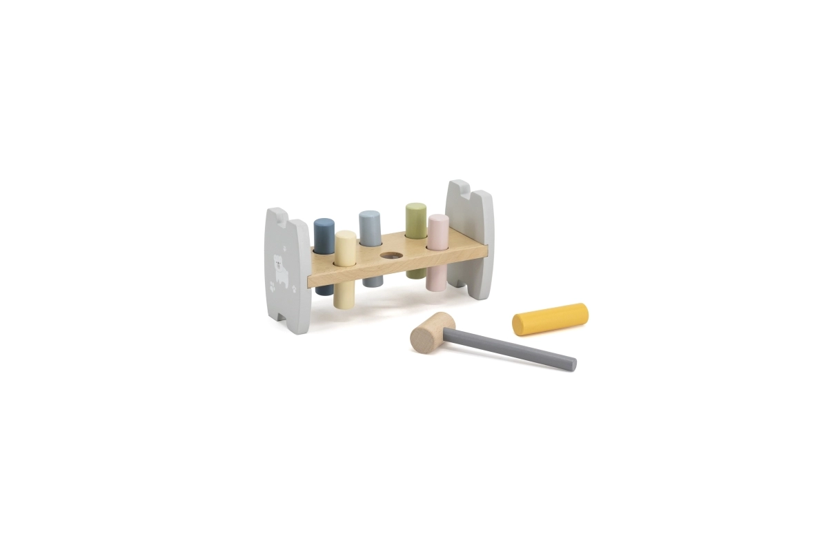 Πολύχρωμοι πείροι και ξύλινο σφυράκι εξασκούν την ακρίβεια χτυπήματος, τον συντονισμό χεριού–ματιού και την ευλυγισία του καρπού – ιδανικά για τα πρώτα κινητικά επιτεύγματα.