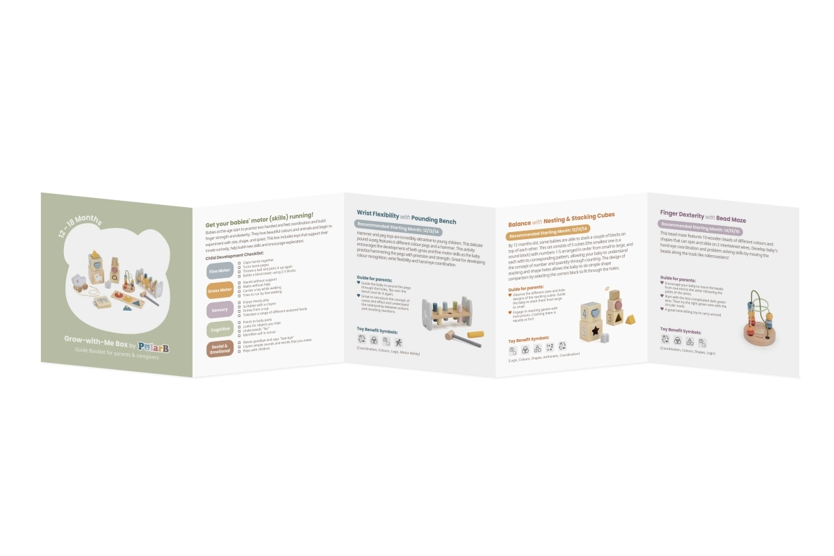 - Πολυδιάστατες δραστηριότητες: πάγκος κτυπήματος, πύργος πέντε κύβων και εισαγωγή σχημάτων, σύρμα με χάντρες, απλά παζλ και συρόμενο ζωάκι