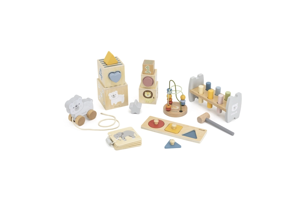 Ανακαλύψτε το έξυπνο ξύλινο σετ για τους μικρούς εξερευνητές που ενισχύει τη λεπτή και αδρή κινητικότητα, την οπτικοκινητική συντονισμένη δράση χεριού–ματιού και την αναγνώριση σχημάτων και χρωμάτων. Η πρακτική συσκευασία δώρου με λαβή κρύβει αγαπημένες δραστηριότητες – πάγκο κτυπήματος, πύργο πέντε κύβων, σύρμα με χάντρες, σχήματα-παζλ εισαγωγής και συρόμενο αρκουδάκι – όλα σε ασφαλή κατασκευή από ποιοτικό ξύλο.