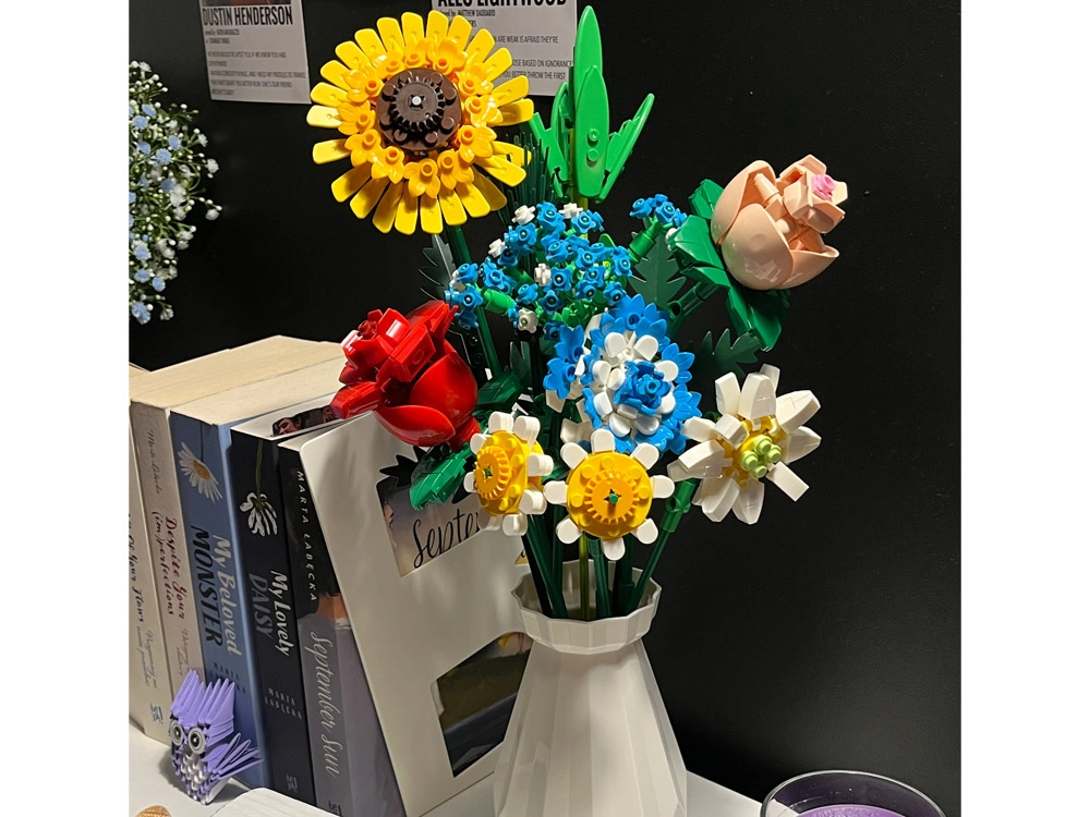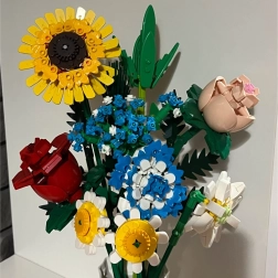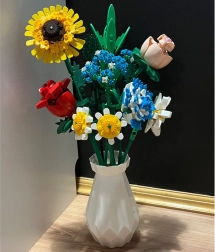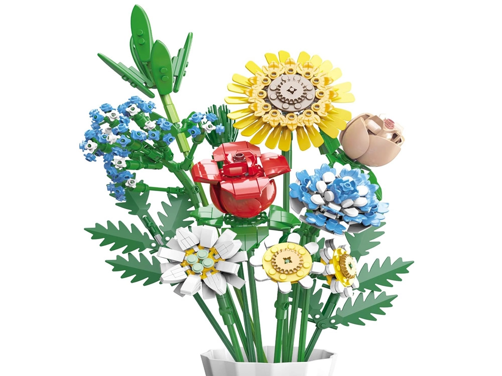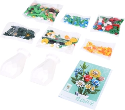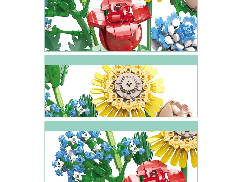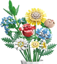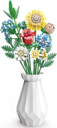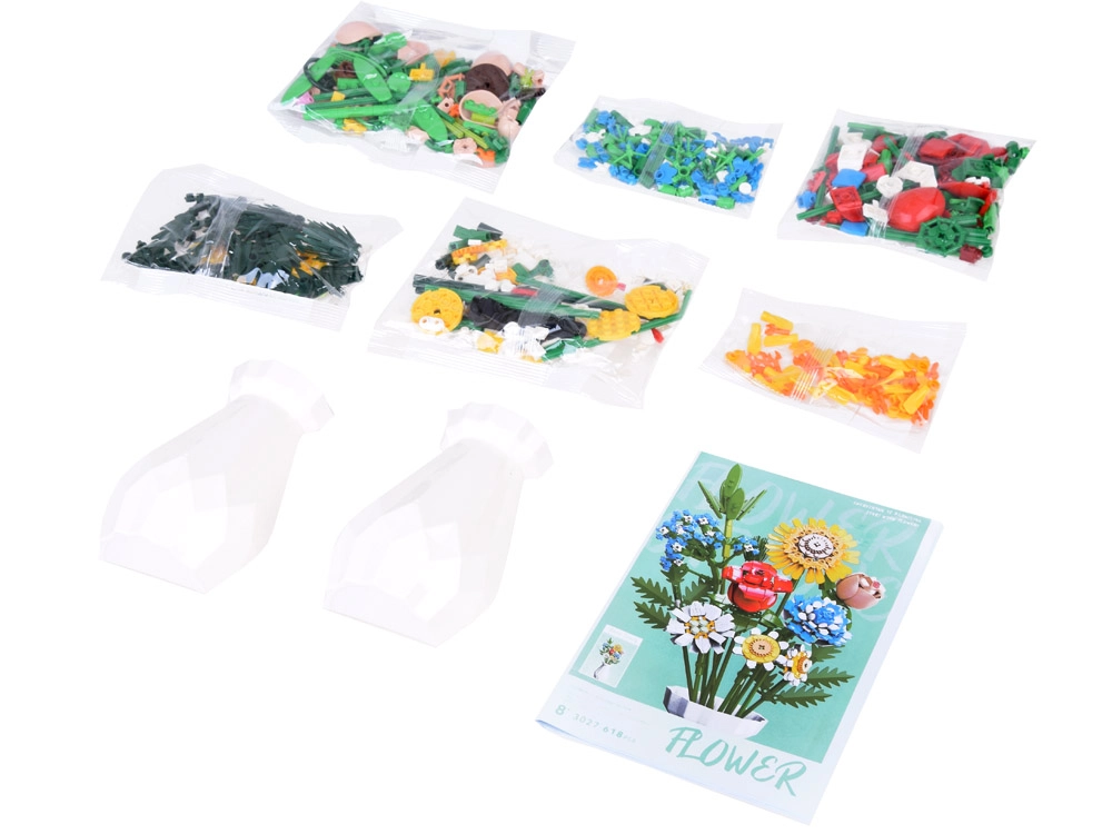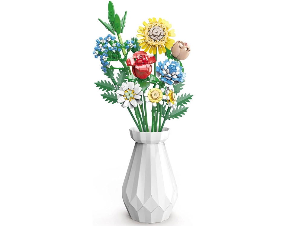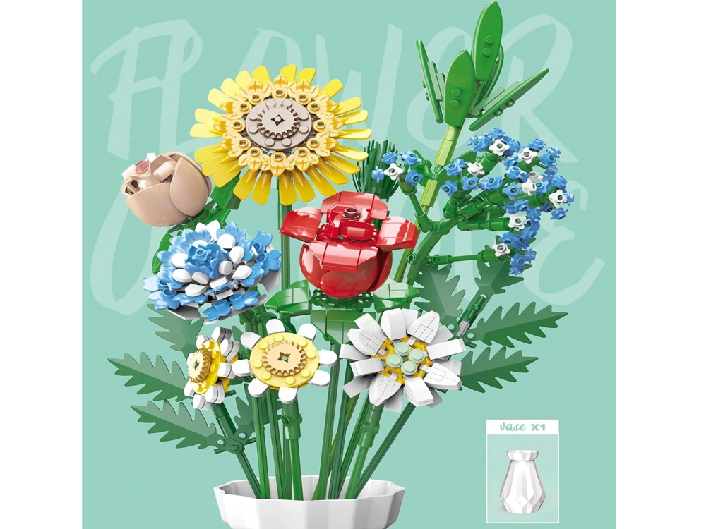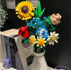 Μετατρέψτε το σετ κατασκευών σε σχεδιαστική διακόσμηση. Η πολύχρωμη ανθοδέσμη από δομικά κομμάτια περιλαμβάνει ηλιοτρόπιο, τριαντάφυλλα, γαρίφαλο, μαργαρίτα, κρίνο, μνημονούλα και πράσινα συμπληρώματα (φύλλα haitong, κέδρος, γρασίδι). Περιλαμβάνεται επίσης κομψό κρεμ φιαλίδιο ώστε να εκθέσετε την έτοιμη ανθοδέσμη αμέσως σε ράφι ή τραπέζι.