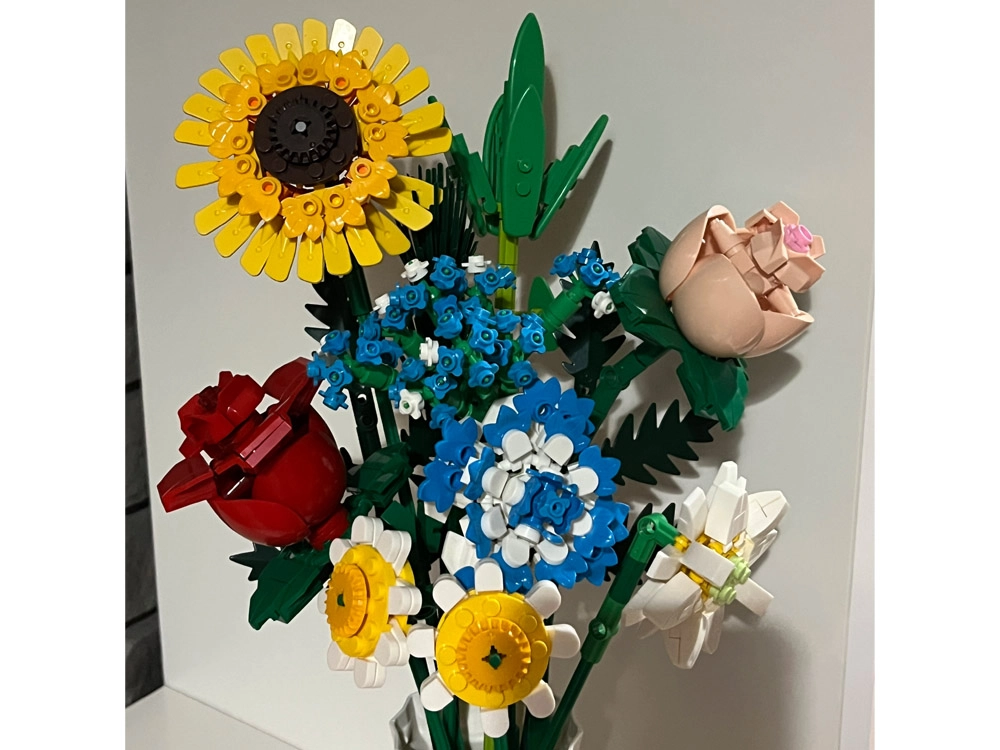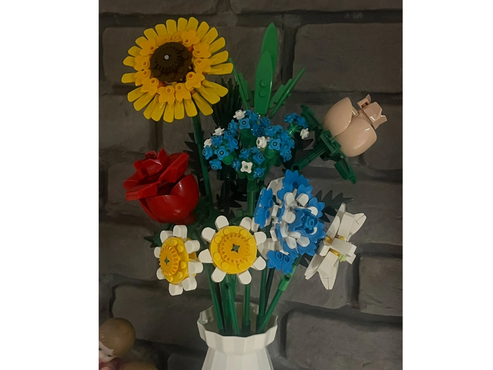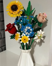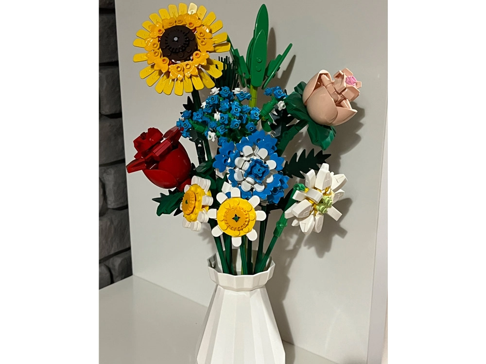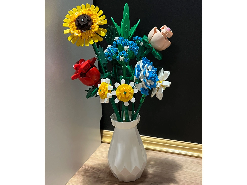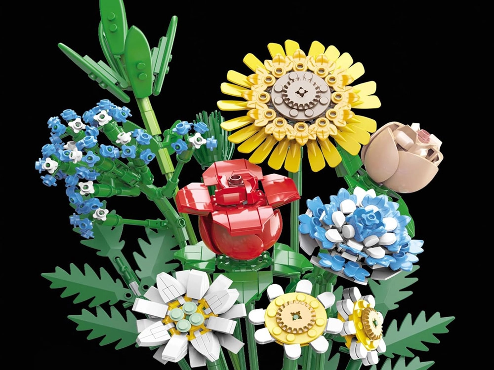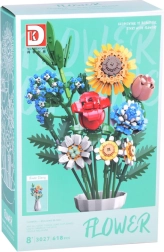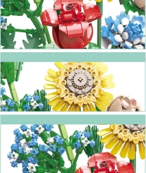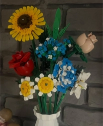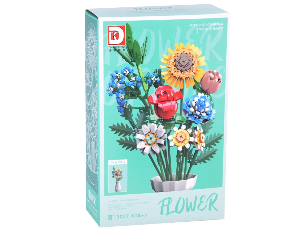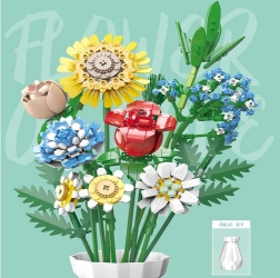 Μετατρέψτε το σετ κατασκευών σε σχεδιαστική διακόσμηση. Η πολύχρωμη ανθοδέσμη από δομικά κομμάτια περιλαμβάνει ηλιοτρόπιο, τριαντάφυλλα, γαρίφαλο, μαργαρίτα, κρίνο, μνημονούλα και πράσινα συμπληρώματα (φύλλα haitong, κέδρος, γρασίδι). Περιλαμβάνεται επίσης κομψό κρεμ φιαλίδιο ώστε να εκθέσετε την έτοιμη ανθοδέσμη αμέσως σε ράφι ή τραπέζι.